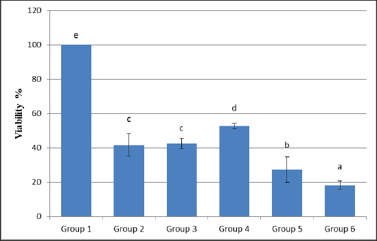 Fig. 2. Data analysis of the viability percentage in each group after treatment with 5-FU, Thymoquinone, MaSCs-Exo and Thymoquinone + MaSCs-Exo (groups 2–5, respectively). Letters on columns denote statistical significance (p < 0.05) using Duncan’s multiple range test. DiscussionCancer progression involves advanced multistep processes where normal body cells regain characters which allow their transformation into abnormal cells and the initiate tumors and malignancy. Such characters are known as “the hallmarks of cancer” and were first defined by Hanahan and Weinberg in 2000 and then modified in 2011 (Hanahan and Weinberg, 2011). Therapeutic agents which can interfere with one or more of these cancer hallmarks became regarded as futuristic anti-cancer therapies. One of these agents is TQ, which possesses an excellent capacity for translation into the clinic, believing that it influences most of the known cancer hallmarks. The discovery of novel tumor-toxic therapies that have lower side-effects on the immune system is considered a valuable aspect of the recent pharmacological studies (Cragg and Newman, 2005).