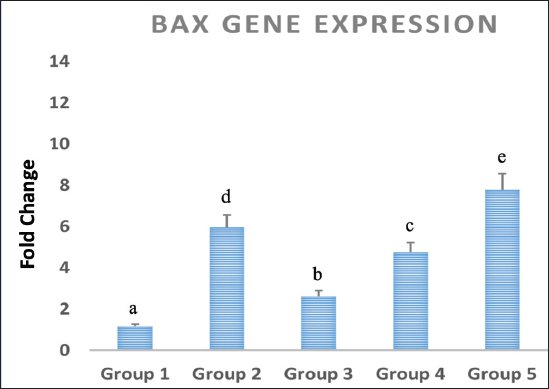 Fig. 3. Data analysis of expression of Bax gene in different study groups, treatment with 5-FU, Thymoquinone, MaSCs-Exo and Thymoquinone + MaSCs-Exo (groups 2–5, respectively). Letters on columns denote statistical significance (p < 0.05) using Duncan’s multiple range test.