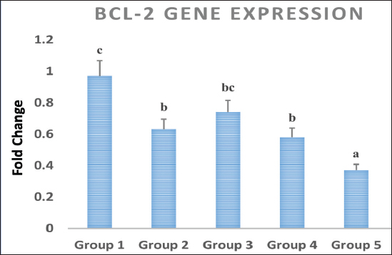Fig. 4. Data analysis of Bcl-2 gene expression in different treated groups, treatment with 5-FU, Thymoquinone, MaSCs-Exo and Thymoquinone + MaSCs-Exo (groups 2–5, respectively). Letters on columns denote statistical significance (p < 0.05) using Duncan’s test.