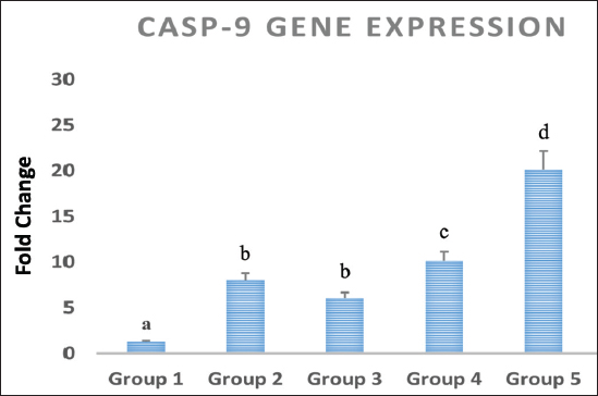 Fig. 5. Data analysis of Caspase-9 (CASP-9) gene expression in different treated groups, treatment with 5-FU, Thymoquinone, MaSCs-Exo and Thymoquinone + MaSCs-Exo (groups 2–5, respectively). Letters on columns denote statistical significance (p < 0.05) using Duncan’s test.