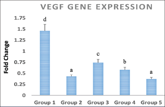Fig. 6. Data analysis of VEGF gene expression in different treated groups, treatment with 5-FU, Thymoquinone, MaSCs-Exo and Thymoquinone + MaSCs-Exo (groups 2–5, respectively). Letters on columns denote statistical significance (p < 0.05) using Duncan’s test. TQ is a major bioactive derivative from N. sativa seeds and oil. Traditional medicine has shown that its seeds were used for various therapeutic benefits such as treating gastrointestinal problems, asthma, digestive problems, headache, hypertension, skin affections and to reduce obesity. The therapeutic and chemo-preventive effects of these “black seeds” were documented in previous research (Padhye et al., 2008). It has been shown that TQ has various anti-proliferative effects regarding different cancer cell lines such as breast, lungs, ovary, colon, laryngeal, osteosarcoma, and leukemia. Chemo-sensitization using TQ has been frequently limited to in-vitro studies, however it shows promising effects as a clinical therapy approach for cancer (Banerjee et al., 2010). 5-FU is an antimetabolite that is extensively used for breast cancer treatment (Fumoleau et al., 2003). However, it is mostly recommended for treating highly aggressive types of breast cancer. Still, 5-FU can be used in the treatment of any stage of breast cancer especially within combination therapies such as CMF (Cyclophosphamide, Methotrexate, and 5-FU), CAF (Cyclophosphamide, Adriamycin, and 5-FU) or CEF (Cytoxan, Ellence, and 5-FU) (Falkson et al., 1992). Immense research has been done to increase the efficacy of the previously mentioned combination strategies for breast cancer treatment. Moreover, combining 5-FU with different recently developed anti-cancer therapies (such as, irinotecan, tomudex, and oxaliplatin) increase their efficiency of response in treating breast cancer (Longley et al., 2003). Drug overdose is still a worldwide common clinical problem which may occur accidentally or intentionally. Therefore, a wide variety of nonspecific therapeutics were industrialized to face such problem (Weinberg et al., 1998). The process of combining TQ with other anticancer drugs that are clinically used can augment their chemotherapy effects. Essentially, TQ has been evidenced to show effective outcomes with advanced anticancer effects with already existing chemotherapeutics. Whilst 5-FU is considered the chemotherapeutic gold standard for different cancers, mainly colorectal cancer and breast cancer. The activity of TQ was shown to have some similarity with 5-FU actions on cell killing and interference with an intercellular metabolic function of SW-626 human colon cancer. Furthermore, the use of TQ combined with 5-FU, TQ led to increasing the pro-apoptotic effects in gastric cancer cells both in vitro and in vivo (Norwood et al., 2007; Lei et al., 2012). Our study demonstrated that TQ and MaSCs-Exo inhibit breast cancer cell line (MCF-7) proliferation which was determined via using the MTT assay, and in a dose-dependent manner both inhibited the fast-growing breast cancer cells and their progression. Different concentrations of TQ and MaSCs-Exo had different cytotoxicity effects on MCF-7 cell after 24 hours of treatment. Increasing concentrations of TQ and Nano-TQ, increased cytotoxicity effect. Also, it was shown for us from this study that, MaSCs-Exo had higher cytotoxicity on breast cancer cells than TQ, when considering the same concentration as TQ concentration. One of the classically used and standardized cytostatic chemotherapy drug is 5-FU which is used for treating cancer (Scheper et al., 1984). Previous studies demonstrated that TQ led to inhibiting the growth of cancer cells and augmented the apoptosis induced by 5-FU in gastric cancer cells both in vitro and in vivo (Lei et al., 2012). Our choice in this study to compare between 5-FU and TQ combined with MaSCs-Exo is due to the fact that combination therapies are much more relevant in treating breast cancer and other types of cancer (Wehler et al., 2013). It was also shown that TQ showed robust antiproliferation effects on breast cancer cells, the effect was more evident when it was in combination with doxorubicin, 5-FU led to increasing its cytotoxic effects as well (Woo et al., 2011). According to our results, breast cancer cell’s viability percentage decreased in the treated groups in comparison to group 1 (control group) but reached the least percentage in group (5) in which we used a combination of TQ and MaSCs-Exo. This means that the combination of TQ and MaSCs-Exo is better than using 5-FU or TQ alone. Our study demonstrated that there is upregulation of Bax and Caspase-9 in groups (2, 3, 4, and 5) treated with 5-FU, TQ, MaSCs-Exo, a combination of TQ and MaSCs-Exo, respectively, compared with the control group. It is noticed that upregulation is higher in group 4 than group 3, and became highest in group 5. This means that MaSCs-Exo is better than TQ, however, TQ is used in a dose which is 2 folds of MaSCs-Exo used dose, while combination of TQ and MaSCs-Exo is better than using 5-FU or TQ or MaSCs-Exo alone. According to our study, Caspase-9 and VEGF were poorly expressed in the control group that received no drugs and a significant increase than the control group in all treated groups. Also, there is increase in the expression of Caspase-9 in groups (2, 3, 4, and 5) treated with 5-FU, TQ, MaSCs-Exo, a combination of TQ and MaSCs-Exo, respectively, compared to the control group, although it is noticed that the increase is higher in group 4 than group 3, and became the highest in group 5. This means that MaSCs-Exo combination with TQ is better than TQ alone, however, TQ is used in a dose which is 2 folds of MaSCs-Exo used dose. Previous research has shown that MSCs exosomes were internalized by both MCF-7 and MDA-MB-231 breast cancer cell lines (Meng et al., 2019). These exosomes were found to inhibit breast cancer cells’ migration and invasion behaviors by downregulating ZNF367 and u