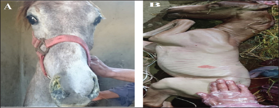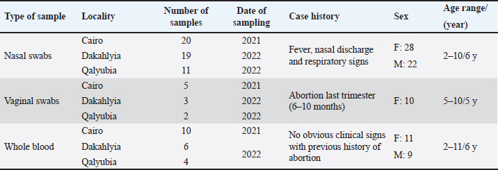 Fig. 1. The selected animals for sampling (A) Horses suffered from respiratory manifestations with nasal discharges, (B) aborted fetus at the last trimester (6–10 months) from the Arabian mares subjected for vaginal swabbing. Table 1. Details of collected samples from different localities during the period 2021–2022.