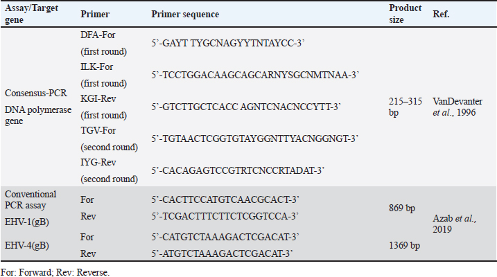 Sample processing and preparationThe processing and preparation of samples was applied in coincidence with World Organization for Animal Health guidelines (OIE, 2015). Nasal and vaginal swabs were placed in 3 ml of phosphate buffer saline (PBS) supplemented with antibiotic-antimycotic solution (100 IU/ml penicillin, 100 μg/ml streptomycin, and 0.25 μg/ml mycostatin B). The solution was collected in a clean sterile tube after vigorous mixing and swabs were discarded. The tubes were immediately frozen and kept at −80°C till examined. Buffy coat separation from collected whole blood samples was performed using Ficoll method. An equal amount of PBS was added to the tube containing blood on anticoagulant (EDTA). 3 ml of Ficoll®400solution (Sigma) (leukocytes separation reagent) was added to a tube. Non-coagulated blood PBS mix was added by pasteur pipette on the wall of the ficoll tube gradually until an insulating layer formation. Complete evacuation of the remaining non-clotted blood in ficoll tube then centrifuged at 3,000 rpm/30 minutes. Three layers are formed. The second layer is evacuated in another tube and completed with PBS then centrifuged at 2,000 rpm/15 minutes. The supernatant was discarded and the sediment collected. Drops of distilled water added on the sedimented cells and mixing by 8-figure for hemolysis of RBCs. Washing of sediment is repeated and then centrifuged at 4,000 rpm for 15 minutes till clear supernatant obtained. After every wash, a drop of sediment was put on a glass slide and examined under a microscope to confirm that sediment became clear from RBCs and only WBCs were present. The buffy coat will be used later for the detection of EHVs. Total viral DNA extractionEHV DNA was extracted from prepared nasal and vaginal swabs using (QIAamp DNA Mini Kit, QIAGEN, Germany), while from whole blood samples using (QIAamp DNA blood Mini Kit, QIAGEN, Germany). Consensus herpesvirus PCRScreening of equine herpesviruses in the extracted DNA was done by consensus PCR using general primers targeting DNA polymerase gene according to Van Devanter (1996) as listed in (Table 2). The primary mixture was prepared as follows; 10 μl master mix, 0.2 μl Primer (DFA), 0.2 μl Primer (ILK), 0.2 μl Primer (KG1), 5 μl Template DNA and nuclease-free water added up to 20 μl. The secondary mixture was prepared as follows; 10 μl master mix, 0.2 μl Primer (TGV), 0.2 μl Primer (IG), 4 μl PCR product of the first cycle and nuclease-free water added up to 20 μl. Primary and secondary mixtures were subjected to amplification in a thermocycler (Biometra, Germany) under a thermal profile for two cycles as follows: a cycle of initial denaturation at 95°C for 5 minutes followed by 40 cycles including (denaturation at 95°C for 30 seconds, annealing 46°C for 60 seconds, and extension at 72°C for 60 seconds) and one cycle of final extension at 72°C for 10 minutes. Conventional polymerase chain reaction assayTyping of DNA extracts was done by conventional PCR using specific primers targeting (gB) for detection of EHV-1 and/or EHV-4 as shown in Table 2. PCR mixture was prepared as follows; 12.5 μl Emerald Amp GT PCR mastermix (2× premix), 1 μl Forward primer (20 pmol), 1 μl Reverse primer (20 pmol), and 5 μl Template DNA PCR grade water was added up to 25 μl. The mixture was placed in a thermocycler. The thermal profile for EHV-1 included 35 cycles for amplification of EHV-1(gB) gene as follows: primary denaturation at 95°C for 5 minutes, secondary denaturation at 94°C for 30 seconds, annealing at 55°C for 40 seconds, extension at 72°C for 50 seconds and final extension 72°C for 10 minutes. The EHV-4 thermal profile also includes 35 cycle for amplification of EHV-4 (gB) as follows: primary denaturation at 95°C for 5 minutes, secondary denaturation at 94°C for 30 seconds, annealing at 55°C for 40 seconds, extension at 72°C for 1.2 minutes, and final extension at 72°C for 12 minutes. Table 2. List of primers used in the current study.