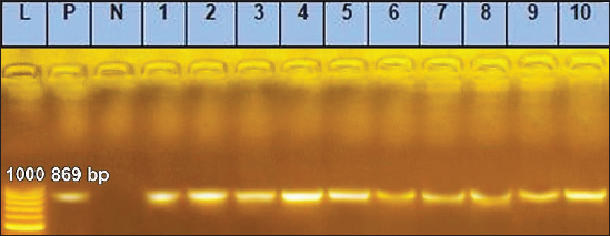 Fig. 3. Agarose gel electrophoresis of conventional PCR amplified DNA products by for EHV-1, (Positive PCR products are at the size of approximately 869 bp). Lane L: 100 bp DNA marker, Lane P: positive control, Lane N: negative Control. 1–10: filed samples.