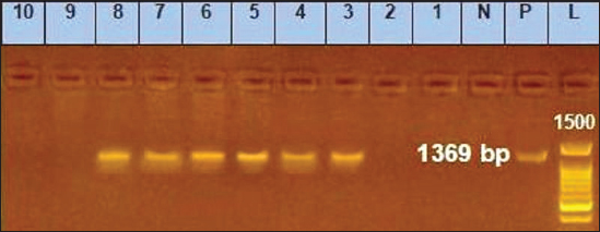 Fig. 4. Agarose gel electrophoresis of conventional PCR amplified DNA products by for EHV-4, (positive PCR products are at the size of approximately and 1,369 bp). Lane L: 100 bp DNA marker, Lane P: positive control, Lane N: negative control, 1–10: filed samples. Molecular typing using conventional PCR assayEHV-1 was found in 29 out of 80 samples with a percentage of 36.25% including 28%3 (14/50) nasal swabs, 50% (5/10) vaginal swabs, and 50% (10/20) whole blood samples. While, EHV-4 was identified in 24 out of 80 samples with percentage of 30% including 36% (18/50) nasal swabs,10% (1/10) vaginal swabs, and 25% (5/20) whole blood samples. Co-infection with EHV-1 and EHV-4 was detected in five samples as seen in (Table 4). Table 4. Result of typing of positive samples by conventional PCR.