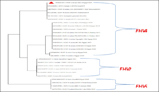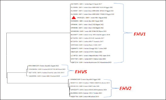 Fig. 6. Phylogenetic tree of EHV-4, 2, 5(gB gene) and EHV-4 local strain of the present study labeled with red triangle as OM362232 MG-4. Screening results revealed that EHV-1 and EHV-4 were identified in 36% and 30% of total of collected samples, respectively. This reflected that both viruses are still circulating among equine populations and EHV-1 is still the most prevalent type of EHVs in Egypt as previously mentioned by Van Maanen et al. (2000). Typing of EHVs in vaginal swabs from aborted mares showed that EHV-1 (Equine virus abortion) was more predominant as 50% than EHV-4 as 10% and this meant that EHV-1 is the main causative agent of abortion cases in mares with severe economic drawbacks in agreement with Azab et al. (2019) and Khattab et al. (2022). While, typing of EHVs in nasal swabs revealed that EHV-4 (rhinopneumonitis) was detected in 36% more than EHV-1 which was identified as 28% which reflected that both viruses are incriminated in respiratory dysfunctions in horses affecting the performance of showcasing and race horses as well as hindering the equine events which represent a source of income as previously mentioned by Gonzalez-Medina and Newton (2015) and Hussey and Landolt (2015). Whole blood samples collected from apparently healthy-vaccinated adult mare with history previous history of abortion were examined with conventional PCR assay which showed 50% and 25% positive samples for EHV-1and EHV-4, respectively which meant that EHVs have the ability for the establishment of latency and that EHV-1 and EHV-4 could be detected in apparently healthy animals as a result of reactivation process from latently infected horses due to external environmental and management stressor factors with sporadic shedding of the virus and this in agreement with Gilkerson et al. (2015). Co-infection with EHV-1 and EHV-4 was identified in five examined samples which reflects the probability of the simultaneous infection of the same horse with EHV-1 and 4 as mentioned by Azab et al. (2019). Phylogenetic analysis of the obtained EHV-1 sequences from the present study showed that they were homogeneous and clustered with previously detected Egyptian EHV-1 strains, indicating complete identity. Furthermore, this sequence is similar to other foreign EHV-1 strains with very low nucleotide substitutions, indicating high stability of the genomic DNA without gB gene diversity (Pusterla et al., 2007, 2009). There was a remarkable similarity between the phylogenetic analysis of the EHV-4 sequence and the previously detected EHV-4 Egyptian strains available on GenBank except for strains except for strains Egypt fawzy_2016 and Egypt isolate-2-2019. EHV-4 whole genome sequencing is recommended during outbreaks of abortion due to the probability of modification of the pathogenesis and behavior of the virus as described by Khattab et al. (2022). There was high heterogeneity and genetic diversity between alphaherpesviruses (EHV-1 and EHV-4) of the present study and gammaherpesviruses (EHV-2 and EHV-5) (Fortier et al., 2010). It is worth mentioning that there are few reports on EHV-2 and EHV-5 in Egypt. Table 6. The nucleotide diversity percentage between Genbank EHV 4, 2, 5 reference strains and local strain EHV-4 strain MG-4-2022 of the current study.