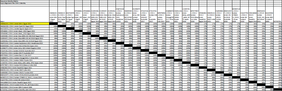 Fig. 5. Phylogenetic tree of EHV-1, 2, 5 (gB gene) and EHV-1 local strain of the present study labeled with red triangle as OM362231 MG-1. Sequencing of EHV-1 and EHV-4 gB geneThe nucleotide sequences of gB gene of the two isolates MG-1 strain, Egypt, 2022 and MG-4 strain, Egypt, 2022 were submitted to the GenBank database under the accession numbers OM362231MG-1 and OM362232 MG-4 for EHV-1 and EHV-4 isolates respectively. Phylogenetic analysis of EHV-1 gB genePhylogenetic analysis of the obtained sequence of EHV-1 (MG-1 strain) with other reference EHV-1, EHV-2, and EHV-5 sequences from GenBank showed that phylogenetic tree divided into two clusters. All Egyptian EHV-1 strains including MG-1and foreign EHV-1 strains were aligned in the first cluster, while the second cluster includes EHV-2 and EHV-5 strains. The phylogenetic tree revealed that EHV-1(MG-1 strain) from the current study was closely related to EHV-1 strains from other countries as seen in Figure 5. The identity percent of the obtained MG-1 strain with other Egyptian strains was 100%, while MG-1 strain showed 65%–100% identity with EHV-1 foreign strains,17% identity with EHV-2 strains and 35%–36% identity with EHV-5 strains. The genetic relationship between the current MG-1 strain and the reference EHV-1 strains indicates ancestral relation of the virus, while low identity percent with EHV-2 and EHV-5 reflects the genetic difference between alphaherpesviruses (EHV-1) and gammaherpresviruses (EHV-2 and EHV-5) as illustrated in (Table 5). Phylogenetic analysis of EHV-4 gB genePhylogenetic analysis of the obtained sequence of EHV-4 (MG-4 strain, Egypt, 2022) with other reference EHV-4, EHV-2, and EHV-5 sequences from GenBank revealed that phylogenetic tree divided into two clusters. All Egyptian and foreign EHV-4 strains including MG-4, Egypt, 2022 strain in addition to EHV-2 strains were aligned in the first cluster, while the second cluster include EHV-5 strains. The phylogenetic tree revealed that obtained EHV 4 strain (MG-4, Egypt, 2022) from the current study was closely related to other EHV-4 strains from other parts of the world (Fig. 6). The identity percent of the obtained MG-4 strain with other Egyptian strains was 100%, while MG-4 strain showed 40%–42% identity with EHV-2 strains and 11%–13% identity with EHV-5 strains (Table 6). The genetic relationship between MG-4 strain and the reference EHV-4 strains indicates ancestral relation of the virus, while low identity percent with EHV-2 and EHV-5 reveals the genetic difference between alphaherpesvirus (EHV-4) and gammahepres virus (EHV-2 and EHV-5). Table 5. The nucleotide diversity percentage between GenBank EHV 4, 2, 5 reference strains and local strain EHV-4 strain MG-4-2022 of the current study.
