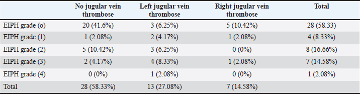 Fig. 3. The number and percentage of horses suffering from EIPH based on the presence of jugular vein thrombosis. Table 1. The association between the presence and degree of EIPH and the presence of jugular vein thrombose in horses affected with exercise intolerance.