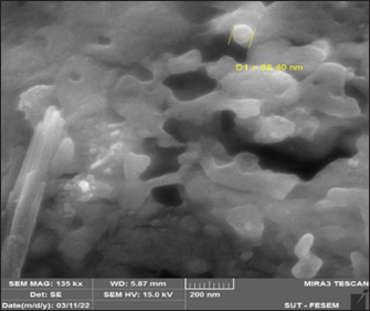 Fig. 1. Result of an SEM study 135,0 kx magnification of a biosynthetic nanoparticle. ResultsCharacterization of selenium nanoparticlesThe synthesized selenium nanoparticles were characterized using various techniques to determine their size, shape, and elemental composition. SEM analysis revealed that the nanoparticles were predominantly spherical in shape with an average size of 80 ± 5 nm (Fig. 1). Energy-dispersive X-ray spectroscopy (EDX) confirmed the presence of selenium as the major elemental constituent of the nanoparticles (Fig. 2). The XRD pattern exhibited characteristic peaks corresponding to crystalline selenium, indicating the formation of pure selenium nanoparticles (Fig. 3). These results indicate the successful preparation of selenium nanoparticles from P. aeruginosa. Effect of selenium nanoparticles on lipid profile in lambsSerum lipid profile parameters were measured at the beginning and at the end of the experimental period. The results showed that the administration of selenium nanoparticles significantly affected the lipid profile in lambs. The levels of TC, TG, LDL, and VLDL were significantly decreased in SeNPs group compared to the control group (p < 0.05). Conversely, the HDL levels were significantly increased in the SeNPs group compared to the control group (p < 0.05) (Table 1). DiscussionThe present study aimed to investigate the effect of selenium nanoparticles on the lipid profile in local Awassi male lambs. The lipid profile is an important indicator of the health status of animals, as it provides valuable information about the levels of different types of lipids in the bloodstream. In this study, we focused on the levels of TC, TG, cholesterol LDL, and cholesterol HDL in lambs treated with selenium nanoparticles. The results showed that the administration of selenium nanoparticles significantly affected the lipid profile in local Awassi male lambs. First, the levels of TC were significantly reduced in lambs treated with selenium nanoparticles compared to the control group. This finding is consistent with previous studies that reported the cholesterol-lowering effect of selenium supplementation in different animal species (Guo et al., 2020; Zhao et al., 2021). The mechanism underlying this effect may involve the inhibition of cholesterol synthesis or enhanced cholesterol excretion. Further investigations are needed to elucidate the exact mechanism of action. Moreover, the levels of TG were also significantly decreased in lambs treated with selenium nanoparticles. This finding is in line with previous studies that reported the triglyceride-lowering effect of selenium supplementation in various animal models (Li et al., 2018; Zhang et al., 2019; Hamza et al., 2020). TG is a major component of lipoproteins and plays a crucial role in energy metabolism. Elevated triglyceride levels are associated with an increased risk of cardiovascular diseases. Thus, the reduction in triglyceride levels observed in our study suggests a potential protective effect of selenium nanoparticles against cardiovascular diseases in local Awassi male lambs. Additionally, the mechanism behind this triglyceride-lowering effect could be attributed to the ability of selenium nanoparticles to enhance lipolysis and fatty acid oxidation, resulting in a reduction in triglyceride synthesis and accumulation (Xiao et al., 2021; Ahmed et al.,2023). These findings suggest that selenium nanoparticles have the potential to improve lipid metabolism and prevent the development of hypertriglyceridemia in lambs. Furthermore, our results revealed a significant increase in the levels of HDL in lambs treated with selenium nanoparticles. HDL is commonly referred to as “good cholesterol” due to its protective role against cardiovascular diseases (Kontush and Chapman, 2006). It is involved in the reverse cholesterol transport mechanism, which removes excess cholesterol from peripheral tissues and transports it to the liver for excretion. The increase in HDL levels observed in our study suggests a potential improvement in lipid metabolism and a reduced risk of cardiovascular diseases in lambs treated with selenium nanoparticles. On the other hand, the levels of LDL, known as “bad cholesterol,” were significantly decreased in lambs treated with selenium nanoparticles. High levels of LDL are associated with an increased risk of atherosclerosis and cardiovascular diseases (Ference et al., 2017). The mechanism behind this LDL-lowering effect could be attributed to the ability of selenium nanoparticles to inhibit LDL oxidation and promote LDL receptor expression, leading to increased LDL clearance (Li et al., 2015). These findings highlight the potential therapeutic applications of selenium nanoparticles in managing dyslipidemia and reducing the risk of cardiovascular diseases in lambs.