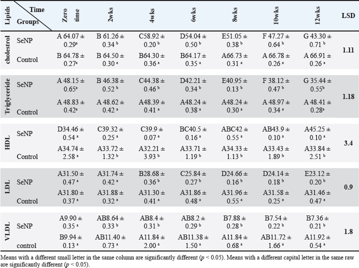 ConclusionIn conclusion, the administration of selenium nanoparticles resulted in significant alterations in the lipid profile of local Awassi male lambs. selenium nanoparticles were found to decrease TC and triglyceride levels, while also reducing LDL levels. However, there is significant changes were observed in HDL levels. These findings suggest that selenium nanoparticles have the potential to improve lipid metabolism and prevent the development of dyslipidemia in lambs. Further studies are warranted to explore the underlying mechanisms responsible for these effects and to determine the optimal dosage and duration of selenium nanoparticle supplementation in lambs. AcknowledgmentsThe authors extended their appreciation to the professors and staff members of the Department of Veterinary Public Health. The authors are grateful to the Faculty of Veterinary Medicine. A special thanks to Dr. Laith Ahmad Yaaqoob in the Biotechnology Department of the Science College at Baghdad University for supporting this work. FundingNone. Authors contributionsAMH performed the experiments and wrote the original paper, while TND supervised the study work. Together with developing and designing the tests, AMH and TND also revised and assessed the content. All writers revised and approved the final content. Conflicts of interestThe authors declared no conflicts of interest with the article or the experiments. Data availabilityAll of the data that support the study’s conclusions are included in the paper. If further information is required, the author is willing to supply it upon reasonable request. ReferencesAbood, H.K. 2012. Clinical study of experimentally induced vitamin E and selenium deficiency in Awassi ewes and their newborn lambs: HK Abood, AMH Judi and AA AL-Ani. Iraqi J. Vet. Med. 36(2), 158–162. Ahmed, W.D., Zahrawi, H.M. and Jassim, M.A. (2023). Effect of Selenium nanoparticles and almond aqueous extract on experimental animals. In IOP Conference Series: Ear. Env. Sci. IOP Publishing, 1262(6), 062030. Alam, H., Khatoon, N., Khan, M.A., Husain, S.A., Saravanan, M. and Sardar, M. (2020). Synthesis of selenium nanoparticles using probiotic bacteria Lactobacillus acidophilus and their enhanced antimicrobial activity against resistant bacteria. J. Clust. Sci. 31, 1003–1011. Alhagiesa, A.W. and Ghareeb, M.M. 2021. The Formulation and Characterization of Nimodipine Nanoparticles for the Enhancement of solubility and dissolution rate. Iraqi J. Pharma. Sci. 30(2), 143–152. Ali, A.T. and Karem, L.K.A. 2024. Biosynthesis, characterization, adsorption and antimicrobial studies of vanadium oxide nanoparticles using Punica granatum extract. Baghdad Sci. J. 21(2), 410. Aljaf, K.A.H. and Bolshakova, M.N. (2023). Nano-selenium-mediated alterations in lipid profile, liver and renal functions, and protein parameters in male lambs: an experimental study. J. Agron. Anim. Indu. 18(2), 230–240. Al-Janabi, A.K.A.F., Salah, S.M. and Wail, M. (2023, April). The effect of using nano-selenium and vitamin D3 on some blood parameters in Male Awassi Lambs. In IOP Conference Series: Ear. Env. Sci. IOP Publishing, 1158(5), 052016. Bokharaeian, M., Toghdory, A. and Ghoorchi, T. (2023). Effects of dietary curcumin nano-micelles on growth performance, blood metabolites, antioxidant status, immune and physiological responses of fattening lambs under heat-stress conditions. J. Ther. Bio. 114, 103585. Dhari, E.A. and Kassim, W.Y. (2019). Effect of adding selenium with or without vitamin E and combination of them on some of productive and physiological characteristics of Awassi Lambs. Bas. J. Agri. Sci. 32(2), 115–125. Ference, B.A., Kastelein, J.J., Ginsberg, H.N., Chapman, M.J., Nicholls, S.J., Ray, K.K., and Sabatine, M.S. (2017). Association of genetic variants related to CETP inhibitors and statins with lipoprotein levels and cardiovascular risk. JAMA 318(10), 947–956. Ghaderzadeh, S., Mirzaei Aghjegheshlagh, F., Nikbin, S. and Navidshad, B. (2019). Correlation effects of nano selenium and conjugated linoleic acid on the performance, lipid metabolism and immune system of male Moghani lambs. Iranian J. Appl. Anim. Sci. 9(3), 443–451. Guo, L., Xiao, J., Liu, H. and Liu, H. (2020). Selenium nanoparticles alleviate hyperlipidemia and vascular injury in ApoE-deficient mice by regulating cholesterol metabolism and reducing oxidative stress. Meta. 12(2), 204–217. Hamza, R.Z., EL-Megharbel, S.M., Altalhi, T., Gobouri, A.A. and Alrogi, A.A. (2020). Hypolipidemic and hepatoprotective synergistic effects of selenium nanoparticles and vitamin. E against acrylamide-induced hepatic alterations in male albino mice. App. Organ. Chem. 34(3), e5458. Judi, A.M.H. 2013. The Effect of Experimentally Induced Vitamin E and Selenium Deficiency on Erythrocytes Osmotic Fragility and Phagocytosis in Pregnant Awassi Ewes and Their Newborn Lamb: The Effect of Experimentally Induced Vitamin E and Selenium Deficiency on Erythrocytes Osmotic Fragility and Phagocytosis in Pregnant Awassi Ewes and Their Newborn Lamb. Iraqi J. Vet. Med. 37(2), 188–191. Kontush, A. and Chapman, M. J. (2006). Functionally defective high-density lipoprotein: a new therapeutic target at the crossroads of dyslipidemia, inflammation, and atherosclerosis. Pharma. Rev. 58(3), 342–374. Kora, A.J. and Rastogi, L. (2016). Biomimetic synthesis of selenium nanoparticles by Pseudomonas aeruginosa ATCC 27853: an approach for conversion of selenite. J. Env. Mana. 181, 231–236. Li, A., Yuan, X., Liang, X. F., Liu, L., Li, J., Li, B., and Tao, Y.X. (2016). Adaptations of lipid metabolism and food intake in response to low and high fat diets in juvenile grass carp (Ctenopharyngodon idellus). Aqua 457, 43–49. Mehdi, Y. and Dufrasne, I. (2016). Selenium in cattle: a review. Molecules 21(4), 545. Mohammadifard, N., Haghighatdoost, F., Rahimlou, M., Rodrigues, A.P.S., Gaskarei, M.K., Okhovat, P., and Sarrafzadegan, N. (2022). The effect of ketogenic diet on shared risk factors