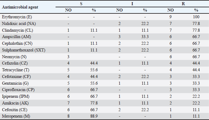 The recovered E. coli serotypes varied in their antimicrobial susceptibility as all isolates were resistant to erythromycin (100%), while showing resistance to nalidixic acid and clindamycin at 77.8% for each. The lowest resistance was recorded to cefoxitin, and meropenem at 11.1% (Table 2). Escherichia coli O28:H2 had a range for MAR index that varied from 0.437 to 1, while that of O119:H6 varied from 0.187 to 0.875, O121:H7 (0.750), O103:H4 (0.437), O17:H18 (0.062), and O145 (0.062), respectively (Table 3). Table 2. Antimicrobial susceptibility of E. coli strains.