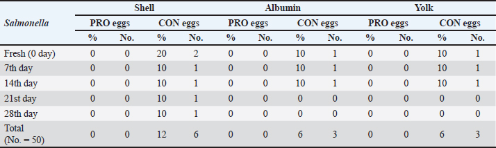 Our study showed in Table 5 a significant variation in the weight of albumin in CON eggs and PRO eggs. During the refrigerated storage period, the albumin weight in CON eggs and PRO eggs decreased in albumen weight with an increased storage period. Also, our results revealed that the statistical analysis of the pH of albumin has more significant difference variations among CON and PRO eggs at different cold storage periods. On the 28th day, it was higher significantly in pH than the other storage periods in CON and PRO eggs. Also, the albumin pH of the 2 groups increased with an increase in storage period. The significant difference in Table 6 is seen in the weight of the yolk of CON and PRO eggs at the different cold storage periods. Also, there were significant variations seen in the pH of the yolk of CON and PRO eggs at different cold storage periods. During the refrigerated storage period, the yolk weight in CON and PRO eggs increased in yolk weight with the increased storage period. Also, the yolk pH of the two groups increased with an increased storage period. DiscussionThe highest prevalence of Salmonella was found in eggshells (12% in CON eggs). On the contrary, the contents of the egg had the lowest incidence of Salmonella in albumin (6% in CON eggs) and in the yolk of eggs (6% in CON eggs). On the other hand, we failed to detect Salmonella in any part of PRO eggs samples. The obtained results of our study were similar to the results obtained by Mansour et al. (2015) who recorded the occurrence of Salmonella in the egg contents (1.2%) and it is lower than in eggshells (4.7%). In another study, Salmonella was isolated from fresh eggshells (6.5%) and egg contents (5.6%) and from stored eggshells (2.8%) and egg contents (7.5%) (Adesiyun et al., 2005). The failure of detection Salmonella from probiotic-supplemented egg contents and eggshells, as the growth promoter, may inhibit the isolation of Salmonella (Sadek et al., 2016). Salmonella coul d not be isolated from the egg contents at fresh and stored eggs until 4 weeks of storage. Isolation from the shell of the fresh egg (0.22%) decreased at storage eggs at 4 weeks of storage to (0.22%) (Stepień-Pyśniak, 2010). Regarding E. coli, it was isolated from eggshells by 36% in CON eggs, and 18% in PRO eggs, which were higher than egg contents which had the incidence of E. coli in albumin (16% in CON eggs, and 4% in PRO) and in the yolk of eggs (18% in CON eggs, and 8% in PRO eggs). Khan et al. (2016) recorded that table eggs were contaminated with E. coli and the highest incidence of E. coli was found in eggshells when compared with eggs’ components (in egg shell 15%, in albumin 12%, and in yolk 10%). Our results were in agreement with the results recorded by Adesiyun et al. (2005) who found that E. coli on eggshells was (58.7%) and (4.3%) in egg contents. Table 5. Chemical and physical characteristics of albumen (weight and pH) of the examined control group and probioticssupplemented group during refrigerated storage.