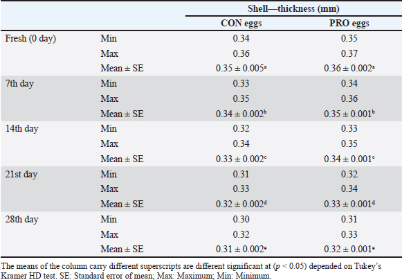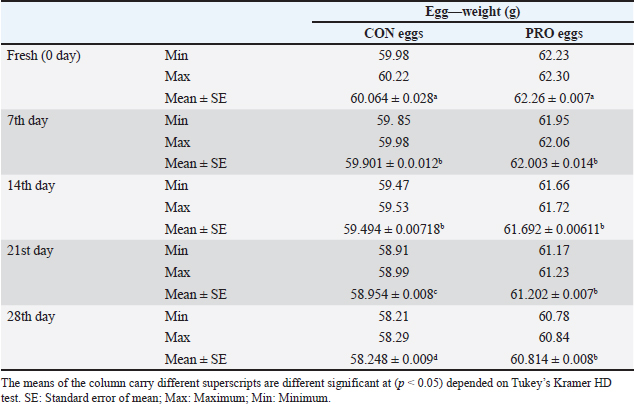Upon storage, on egg albumin, E. coli at fresh eggs (0.67%) decreased with storage to (0.44%) at 4 weeks of storage. Similarly, E. coli at fresh eggs (0.45%) decreased with storage to (0.17%) at 4 weeks of storage. Also, on eggshells E coli at fresh eggs (2.63%) decreased with storage times to (0.47%) at 4 weeks of storage (Stepień-Pyśniak, 2010). In contrast, isolated microorganisms from eggs and contents might live at several different temperatures i.e. (4°C and 60°C). However, Salmonella could not be isolated, and this explains why all eggs were free from Salmonella (Osei-Somuah et al., 2006). Since E. coli is normally considered an inhabitant in a hen’s intestine; it is easily found on eggshells, and moreover, in egg contents. Thus, it gets its pathogenic importance. It also causes public health hazards and diarrhea (Awny et al., 2018). The presence of E. coli in eggs is a major indication of fecal contamination in eggshells, which causes hazards to human public health (Sadek et al., 2016). The Microbial Gut community plays a great role in the performance and health of the host. Therefore, the ability of probiotic supplements to promote the health effects gained a higher scientific interest in the last years (Duggan et al., 2002). For PRO eggs at fresh days were (62.26 ± 0.007 g) and at 28 days were (60.814 ± 0.008 g) with 1.4% weight loss. For CON eggs at fresh day was (60.064 ± 0.28 g) and at 28 days was (58.248 ± 0.009 g) with 1.816% weight loss. The results declared a decrease in egg weight loss by increasing the storage time in PRO eggs than CON eggs. The eggs from PRO-supplemented hens saw an accumulative loss of weight 11% lower than the eggs from control hens with a 15% lower weight loss was agreement with the result (Camila et al., 2022). Egg weight loss increased by the time of cold storage periods (7th day-21st day) from (1.91 g) to (3.60 g) these results were shown by Okoleh and Eze (2016). The decrease in the weight of the egg on the 7th day (0.36 g) and on the 14th day (0.57 g) during cold storage periods was concluded by Walsh et al. (1995). The significant decrease in the weight of eggs observed during the period of storage (4 weeks) could be caused by the increase of pores on the shells of aged eggs. The increase of the pores of the shell may cause easy escaping of gases and moisture from eggs. The carbonic acid breakdown occurred inside the albumin and then produced water and carbon dioxide. Carbon dioxide escapes from the pores of the shell and the albumin becomes watery and loses its thickness, this is the cause of weight loss of eggs (Eke et al., 2013). The highest thickness of eggshell (mm) was reported on laying day (fresh) in PRO (0.36 ± 0.002) and in CON eggs (0.35 ± 0.005); however, on the 28th day, the lowest thickness of shell egg in PRO (0.32 ± 0.001) and in CON eggs (0.31 ± 0.002). The PRO eggs reported an increase in the weight of shell eggs by 1% when compared to the control group (Camila et al., 2022). These results differed from the results obtained by Kralik et al. (2014). They concluded that the cold storage periods have no effect on the thickness of eggshells. In our study, the statistical analysis of the weight of albumin showed significant variation in PRO eggs on the fresh day (36.45 ± 0.0071) and on the 28th day (34.83 ± 0.008). Also, in CON eggs there was a significant difference on a fresh day (35.76 ± 0.004) and on the 28th day (33.31 ± 0.009). The mean albumin weight of PRO eggs on the lying day was (36.16 ± 0.623) and on the 28th day was (33.83 ± 0.793). While in CON eggs, there was a significant difference on the laying day (35.76 ± 0.613) and on the 28th day (33.31 ± 0.227) (Camila et al., 2022). Also, a decrease in the weight of albumin in fresh eggs (41.12 g) and in eggs stored for the 28th day (39.96 g) was seen (Kralik et al., 2014). Albumin produced in the magnum by the epithelial cells also contains protein and a clear colloidal solution. The quality of albumin is considered a parameter of protein quality and the freshness of an egg. Loss of albumin weight showed in the probiotic supplements, due to high deposition of protein on eggs. It happens due to intestinal microbiota modulation that provides good digestion and absorption of nutrients (Sobczak and Kozlowski, 2021). The weight of yolk gradually increases from the fresh day (lying day) in PRO eggs (18.20 ± 0.006) and (18.41 ± 0.006) on the 28th day of storage, also fresh day (laying day) in CON eggs (16.92 ± 0.07) and (17.59 ± 0.009) at the 28th day of storage. Other scientists reached nearly the same results that probiotics gradually increased the yolk weight from fresh day in PRO eggs (21.34 ± 0.005) and (23.05 ± 0.003) until the 28th day of storage, also from fresh day in CON eggs (21.07 ± 0.04) and (22.36 ± 0.002) until the 28th day of storage (Gunhan and Kirikçi, 2017, Camila et al., 2022). The yolk weight increase is due to the functionality of hepatocytes to synthesize the Vitellogenin (Kasiyati et al., 2016). Vitellogenin is considered a protein that is responsible for the transportation of lipids to the yolk from the liver. Regarding the pH of albumin, it determines the quality of albumin. So that it measured the egg freshness (Scott and Silversides, 2000). Our results revealed that the statistical analyses of the pH of albumin on a fresh day (lying day) PRO egg pH mean was (8.20 ± 0.005) and (8.89 ± 0.009) on the 28th day of storage. Fresh day (laying day) in CON egg pH mean was (8.244 ± 0.006) and (9.16 ± 0.006) on the 28th day of storage. Camila et al. (2022) also discussed that and found that Albumin pH increased gradually from the fresh day in PRO eggs (9.15 ± 0.003) and (9.42 ± 0.008) until the 28th day of storage and from the fresh day in CON eggs (9.16 ± 0.02) and (9.51 ± 0.002) until the 28th day of storage. Therefore, the significant increase in pH of albumin with the increase of the storage time. Our results were simil