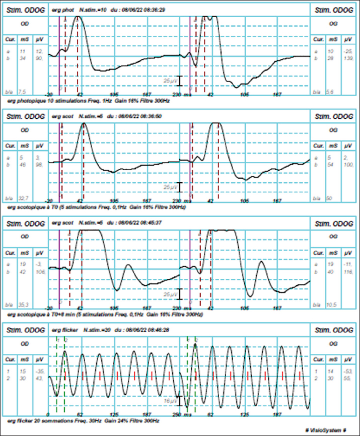 AbstractBackground: The occurrence of cataracts in rabbits is a common reason for consultation in veterinary ophthalmology. Case Description: A 6-year-old female Lop rabbit (Oryctolagus cuniculus) was referred with a 3-month history of bilateral cataracts. The owner noted that the rabbit was frequently bumping into obstacles. Physical examination was unremarkable. Routine hemogram and biochemistry panel were within usual values, and Encephalitozoon cuniculi were not detected by serology. A complete ophthalmological examination revealed bilateral hypermature cataracts causing total blindness. Bilateral tonometry showed normal intraocular pressures. Electroretinography (ERG) under general anesthesia revealed strong photoreceptor responses for each eye, and ocular ultrasound was normal except for bilateral hypermature cataracts. Following ERG, during the same anesthesia session, conventional phacoemulsification followed by acrylic intraocular lens (IOL; +58D) implantation was performed uneventfully in both eyes. Follow-up examinations were carried out for 1 year. Except for immediate post-operative bilateral corneal ulcers that were quickly cured with medical treatment, no other post-operative complications were observed. The 1-year follow-up examination revealed centered IOLs without posterior capsular opacity, enabling the observation of normal fundus in both eyes. The owner confirmed the rabbit had normal autonomy and moved with accuracy, as observed during follow-up visits and on videos provided by the owner. Conclusion: To the best of our knowledge, this is the first described case of successful bilateral phacoemulsification and bilateral intraocular lens implantation with prior electroretinographic evaluation of the retinal function in a pet rabbit with cataracts. Keywords: Cataract, Electroretinography, Intraocular lens, Phacoemulsification, Rabbit. IntroductionCataract, defined as an opacity of the lens or lens capsule is one of the most common causes of visual impairment and blindness in humans and animals (Glover and Constantinescu, 1997). Phacoemulsification cataract extraction with intraocular lens implantation is the standard surgical procedure in veterinary and human medicine. There is little information about the occurrence of spontaneous cataracts in rabbits (Williams, 2012; Gomes et al., 2018). The occurrence of cataracts in rabbits is low, a study of 1000 rabbits showed a low proportion of animals with cataracts with only 45 animals from that 1,000 having lens changes (Williams, 2021). The clinical case presented here describes the successful surgical management of bilateral cataracts in a healthy pet rabbit (Oryctolagus cuniculus) by bilateral phacoemulsification and bilateral intraocular lens implantation with prior electroretinographic evaluation of the retinal function. Case DetailsHistoryA 6-year-old female lop rabbit was referred to our hospital with a 3-month history of bilateral cataracts. The owner reported that the rabbit had frequently bumped into obstacles for the past 2 weeks, but no discomfort had been detected. The rabbit lived indoors with exits in the garden, the owners did not report any traumatic incident. The referring veterinarian had diagnosed bilateral mature cataracts and performed routine bloodwork and serum submission for indirect immunofluorescence for Encephalitozoon cuniculi. Results of routine hemogram and biochemistry were unremarkable and E. cuniculi was not detected by serology. Ophthalmic examinationA thorough ophthalmologic examination was performed. Palpebral, dazzle, direct, and indirect pupillary light reflexes were present in both eyes (oculus uterque OU). There was no pupil size asymmetry. The Schirmer tear test (Schirmer Tear Test, MSD Animal Health, Merck &Co., Inc., Rahway, NJ, USA) values were 13 mm/minute for the right eye (oculus dexter OD) and 11 mm/minute for the left eye (oculus sinister OG). Fluorescein stain (Fluoresceine 0.5% TVM, Dômes Pharma, Lempdes, France) was negative OU. Tonometry (Tonovet, Icare, Vantaa, Finland) revealed intraocular pressure (IOP) of 12 mm Hg OD and 11 mm Hg OS. Slit-lamp biomicroscopy examination (Hawk-eye, Dioptrix, Toulouse, France) revealed bilateral hypermature cataracts (Fig. 1), that prevented examination of the fundus OU by indirect ophthalmoscopy. No aqueous flare was apparent OU. On physical examination, the rabbit was in excellent overall condition. Electroretinography (ERG)Electroretinography under general anesthesia was scheduled to assess retinal function. Mydriasis was obtained with tropicamide eye drops (Mydriaticum 2 mg/0.4 ml, Thea Pharma, Clermont-Ferrand, France) (1 drop every 5 minutes for 20 minutes). The rabbit was premedicated with medetomidine (Dormilan, Axience, Barcelona, Spain) intramuscularly (0.07 mg/kg) and morphine hydrochloride (Morphine, CDM Lavoisier, Paris, France) subcutaneously (0.1 mg/kg). Afterward, general anesthesia was induced with ketamine (Anesketin, Dechra, AE Bladel, The Netherlands) intramuscularly (5 mg/kg) and intubation with a 2.0 endotracheal tube was performed. Anesthesia was maintained with 1.5% isoflurane (IsoFlo, Zoetis, Malakoff, France) delivered in oxygen. A 24-gauge catheter was set in the caudal auricular vein and sterile saline solution was delivered throughout the procedure. Electrodes were placed classically on each superior eyelid conjunctiva and subcutaneously at the base of each ear (Fig. 2). A reference electrode was placed subcutaneously on the dorsal neck. ERG (Visiosystem, Siem Bio-Medicale, Nîmes, France) was then performed: first an achromatic stimulation (1 Hz) in photopic conditions, followed by a blue stimulation (0.1 Hz) in scotopic conditions, another blue stimulation (0.1 Hz) after 8 minutes of dark adaptation, and then an achromatic flicker stimulation (30 Hz) in the photopic atmosphere. Bilateral recordings revealed strong photoreceptor responses for each eye (Fig. 3). Ocular ultrasonographyVitreoretinal ultrasonog