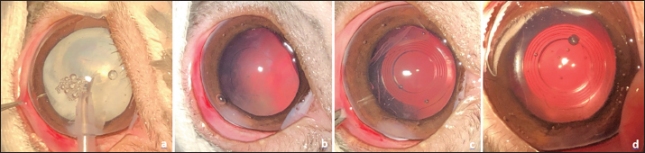Fig. 5. Surgical steps pictures. One-handed phacoemulsification for right eye (a), aspect after irrigation-aspiration of the cortical material and polishing of the posterior capsule for the same eye (b). Aspect after implantation of intraocular lens in the capsular bag, before corneal incision suture, for the right eye (c), for the left eye (d). Ethical approvalNo ethical approval was needed for this article. DiscussionThere are different causes of cataracts in rabbits: congenital, juvenile, senile, Encephalitozoon cuniculi infection, and genetic (Geeraets et al., 1965; Gelatt, 1975; Ashton et al., 1976; Felchle and Sigler, 2002; Giordano et al., 2005; Künzel et al., 2008; Williams, 2013; Peng et al., 2015). Spontaneous cataracts have been described in rabbits, especially in young animals and are consistent with an inherited origin (Munger et al., 2002). In our case described here, serologic tests were negative for Encephalitozoon cuniculi and there were no neurological abnormalities or phacoclastic uveitis. The cause for cataracts was not determined in our case, but was supposed inherited. Retinal diseases in rabbits are poorly described; one case of spontaneous retinal degeneration in a laboratory animal (Reichenbach and Baar, 1985) and an isolated case of retinal toxicity following oral administration of ofloxacin (Rampal et al., 2008) have been reported. Although retinopathies are therefore rare in rabbits, we carried out an electroretinographic examination, as we routinely do for domestic carnivores prior to any cataract surgery. Moreover, cataract surgery is not as routinely performed in rabbits as in dogs. As little is known about spontaneous retinal diseases in rabbits, and as the bilateral cataract procedure is quite expensive and risky (considering the anesthetic risk), we think that retinal function evaluation by ERG is relevant. Furthermore, the retinal function evaluation by ERG is very common in laboratory animal medicine such as rabbits to assess the retinal toxicity of xenobiotics used in ophthalmology. In rabbits, the photoreceptor population is essentially dominated by rods (95%) (Famiglietti and Sharpe, 1995). The ERG performed in our case showed a strong photoreceptor response in both photopic and scotopic atmospheres. During phacoemulsification in rabbits, cases of iris prolapse into the keratotomy wound have been described due to the convexity of the iris in this species, this complication being favored by suboptimal mydriasis (Gomes et al., 2018), and by a very shallow anterior chamber in rabbits, worsened by the mature cataract and the higher lens volume. We did not encounter any intraoperative difficulties of this type in our case, the mydriasis having been total and stable during the surgery.
