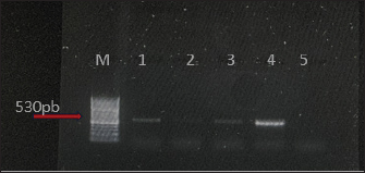Fig. 3. PCR amplification applying D. gallinae s samples using: ITS the internal transcribed spacers of the ribosomal; (M) a DNA ladder placed on the left sides of the gel; fragment sizes characterized in base pairs (530 bp). (Bands 1-4 D. gallinae samples); sample five negative control.