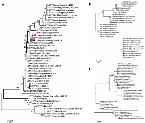 Fig. 3. Phylogenetic tree based on GPCR gene (A), P32 gene (B), and RPO30 gene (C) sequences showing the genetic relationship of LSDV strains from Ha Tinh province in north-central Vietnam with LSDV reference strains. The sequences obtained from this study are labeled in red triangles. Other LSDV, SPPV, and GTPV sequences analyzed are from GenBank. Bootstrap values of 1,000 replicates are shown when higher than 70%. The consensus tree was rooted in reference to the three poxvirus outgroups and was broken up to show the distant relationship between them and CaPVs. The collective findings underscore the importance of conducting a comprehensive analysis of the entire LSDV genome to monitor potential alterations and the further spread of the virus. Controlling the transmission of the LSDV is crucial, alongside investigating its prevalence and determining the most appropriate vaccination strategy in Vietnam. Additionally, various measures, such as enhancing biosafety awareness, intensifying oversight of illegal animal movements and product transport, and reducing the population density of LSDV vectors, could mitigate the risk of transmission within Vietnam. Finally, the development of a safe and effective LSDV vaccine stands as the optimal long-term solution to safeguard Vietnam and other nations against the virus. ConclusionWe demonstrated that the LSDV/Vietnam/HaTinh/CX01 strain isolate belongs to a new variant of LSDV, and the GPCR gene's sequencing analysis is of great concern for sub-grouping LSDV circulating in Vietnam. This finding is new and suggests that at least two different variants of LSDV are circulating in Vietnam based on analysis of the GPCR gene. Additionally, the combination methods, including PCR, virus isolation, and electronic electron microscopy imaging, were powerful methods to confirm the presence of LSDV in clinical samples. AcknowledgmentsThe authors thank the staff of Region Animal Health Office 3 in Nghe An for their support in sampling. The author also thanks Dr. Andrew G. Yersin of Kemin Industries, Inc., Scott Avenue, Des Moines, IA 50317, USA, for the English revision. Conflict of interestThere are no potential conflicts of interest. FundingThe Ministry of Science and Technology supported this work to Ha Thi Thanh Tran (Project code: ĐTĐL.CN-11/23). Data availabilityAll sequences of LSDV/Vietnam/HaTinh/CX01 strain generated in this study were submitted to GenBank under Accession Nos OR137808-10 for p32 genes, RPO30 genes, GPCR, and genes, respectively. Authors’ contributionsHTTT, ADT, and HVD conceived and designed the experiments. HTTT, ADT, ATT, CTN, and VNT performed the experiments. HTTT, ADT, and HVD analyzed the data. HVD and HTTT contributed reagents, materials, and analytical tools. HTTT, ADT, and HVD wrote the manuscript. All authors read and approved the final manuscript. ReferencesAcharya, K.P., Subedi, D., 2020. First outbreak of lumpy skin disease in Nepal. Transbound. Emerg. Dis. 67(6), 2280–2281. Agianniotaki, E.I., Mathijs, E., Vandenbussche, F., Tasioudi, K.E., Haegeman, A., Iliadou, P., Chaintoutis, S.C., Dovas, C.I., Van Borm, S., Chondrokouki, E.D., De Clercq, K., 2017. Complete genome sequence of the lumpy skin disease virus isolated from the first reported case in Greece in 2015. Genome Announc. 5(29), e00550–17. Alexander, S., Olga, B., Svetlana, K., Valeriy, Z., Yana, P., Pavel, P., Aleksandr, K., 2019. A real-time PCR screening assay for the universal detection of lumpy skin disease virus DNA. BMC Res. Notes 12, 371. Beard, P.M., 2016. Lumpy skin disease: a direct threat to Europe. Vet. Rec. 178, 557–558. Biswas, S., Noyce, R.S., Babiuk, L.A., Lung, O., Bulach, D.M., Bowden, T.R., Boyle, D.B., Babiuk, S., Evans, D.H., 2020. Extended sequencing of vaccine and wild-type capripoxvirus isolates provides insights into genes modulating virulence and host range. Transbound. Emerg. Dis. 67, 80–97. Casal, J., Allepuz, A., Miteva, A., Pite, L., Tabakovsky, B., Terzievski, D., Alexandrov, T. and Beltran-Alcrudo, D. 2018. Economic cost of lumpy skin disease outbreaks in three Balkan countries: Albania, Bulgaria and the Former Yugoslav Republic of Macedonia (2016-2017). Transbound. Emerg. Dis. 65(6), 1680–1688. Cetre-Sossah, C., Dickmu, S., Kwiatek, O., Albina, E., 2017. A G-protein-coupled chemokine receptor: A putative insertion site for a multi-pathogen recombinant capripoxvirus vaccine strategy. J. Immunol. Methods 448, 112–115. Departmen Animal Health (DAH), Vietnam., 2023. Anumal repport of diseases in animal, Vietnam, 2023. Offically Anumal Report. DAH, Hanoi, Vietnam. El-Tholoth, M., El-Kenawy, A.A., 2016. G-protein-coupled chemokine receptor gene in lumpy skin disease virus isolates from cattle and water buffalo (Bubalus bubalis) in Egypt. Transbound. Emerg. Dis. 63, e288–e295. Flannery, J., Shih, B., Haga, I.R., Ashby, M., Corla, A., King, S., Freimanis, G., Polo, N., Tse, A.C., Brackman, C.J., Chan, J., Pun, P., Ferguson, A.D., Law, A., Lycett, S., Batten, C., Beard, P.M., 2022. A novel strain of lumpy skin disease virus causes clinical disease in cattle in Hong Kong. Transbound. Emerg. Dis. 69, e336–e343. Hasib, F.M.Y., Islam, M.S., Das, T., Rana, E.A., Uddin, M.H., Bayzid, M., Nath, C., Hossain, M.A., Masuduzzaman, M., Das, S., Alim, M.A., 2021. Lumpy skin disease outbreak in cattle population of Chattogram, Bangladesh. Vet. Med. Sci. 7, 1616–1624. Kononov, A., Byadovskaya, O., Kononova, S., Yashin, R., Zinyakov, N., Mischenko, V., Perevozchikova, N., Sprygin, A., 2019. Detection of vaccine-like strains of lumpy skin disease virus in outbreaks in Russia in 2017. Arch. Virol. 164, 1575–1585. Kumar, S., Stecher, G., Tamura, K., 2016. MEGA7: molecular evolutionary genetics analysis version 7.0 for bigger datasets. Mol. Biol. Evol. 33, 1870–1874. Le Goff, C., Lamien, C.E., Fakhfakh, E., Chadeyras, A., Aba-Adulugba, E., Libeau, G., Tuppurainen, E., Wallace, D.B., Adam, T., Silber, R., Gulyaz, V., Madani, H., Caufou