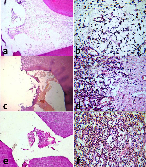 Fig. 2. Photomicrographs of the immunosuppressed group after one month. MTA subgroup showing the exposure site without dentine bridge formation (a) and infiltration of the pulp with inflammatory cells (b). BA subgroup showing the exposure site with partial dentine bridge formation (c) and dilated and congested blood vessels with areas of fibrosis (d). Ca(OH)2 subgroup showing the exposure site without dentine bridge formation (e) and heavy inflammatory cell infiltration (f). The images (a), (c) and (e): H&E, X10 while (b), (d), and (f): H&E, X40. Group II (control group) In subdivision 1 (after one month), subgroup A had a regular architecture in the area opposite the exposure site, a partially degenerated odontoblastic layer, and complete dentine bridge formation. There were numerous congested blood vessels in the superficial and middle portions of the pulp with few infiltrated inflammatory cells. Subgroup B exhibited an irregular odontoblastic layer with complete dentine bridge formation and congested blood vessels in most samples (Fig. 4a). The pulp tissue appeared to regain its integrity with the absence of inflammatory cells in the middle portion of the pulp. Subgroup C had a damaged odontoblastic layer with partial dentine bridge formation. Few inflammatory cell infiltrates and dilated blood vessels were seen in the middle portion of the pulp (Fig. 4b).