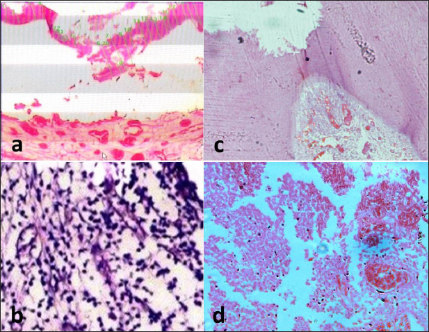 Fig. 4. Representative photomicrograph of the control group after one and two months. (a) BA subgroup after one month showing the exposure site with complete dentine bridge formation. (b) The Ca(OH)2 subgroup showing few inflammatory cell infiltrates in the middle portion of the pulp. (c) MTA subgroup after two months showing well-organized odontoblastic layer with no inflammatory cell infiltrates and no dilated blood vessels opposite to the completely formed dentine bridge. BA subgroup after two months showing dilated blood vessels with few inflammatory cells (d). The images (a) and (c): H&E, X10 while (b) and (d): H&E, X40. Table 1. Mean and SD of inflammatory cell count in all groups, subgroups and subdivisions.