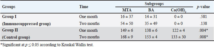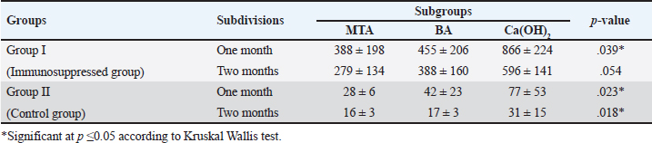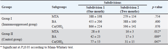 Quantitative findings of the inflammatory cellsThere were significant differences in the mean inflammatory cell count between group I (immunosuppressed group) and group II (control group) in both subdivisions (p < 0.05). Group I (immunosuppressed group)In subdivision 1 (after one month), the mean inflammatory cell count was 388 ± 198, 455 ± 206, and 866 ± 224 in subgroups A, B, and C, respectively (Table 1). There was a significant difference between the three subgroups (p < 0.05). In subdivision 2 (after two months), the mean inflammatory cell count was 279 ± 134, 388 ± 160, and 596 ± 141 in subgroups A, B, and C, respectively (Table 1). There was no significant difference between the subgroups (p > 0.05). In group I, all subgroups showed a decrease in the mean inflammatory cell count over time. The mean cell count decreased dramatically after two months. However, the decrease in the mean inflammatory cell count was statistically not significant in all subgroups (Table 2). Regarding the effect of subgroups on inflammatory response in the two subdivisions, all subgroups showed a difference in the mean inflammatory cell counts in group I after one month. However, there was no significant difference between subgroups A and B (p > 0.05). The difference in the mean inflammatory cell count was statistically significant between subgroups A and C (p < 0.05) and between subgroups B and C in group I after one month (p < 0.05). In group I after two months, all subgroups showed a difference in the mean inflammatory cell counts. There was no significant difference in the mean inflammatory cell counts between subgroups A and B (p > 0.05). However, the difference between subgroups A and C was statistically significant (p < 0.05). There was no significant difference in the mean inflammatory cell counts between subgroups B and C (p > 0.05) as shown in Table 3. Group II (control group)In subdivision 1 (after one month), the mean inflammatory cell count was 28 ± 6, 42 ± 23, and 77 ± 53 in subgroups A, B, and C, respectively (Table 1). There was a significant difference between the three subgroups (p < 0.05(. In subdivision 2 (after two months), the mean count was 16 ± 3, 17 ± 3, and 31 ± 15 in subgroups A, B, and C, respectively (Table 1). However, no significant difference between the subgroups was detected (p > 0.05). The tested subgroups exhibited a significant decrease in the mean inflammatory cell count after two months (p < 0.05). Table 2. Effect of time on inflammatory response (mean ± SD) in all tested groups, subgroups and subdivisions.