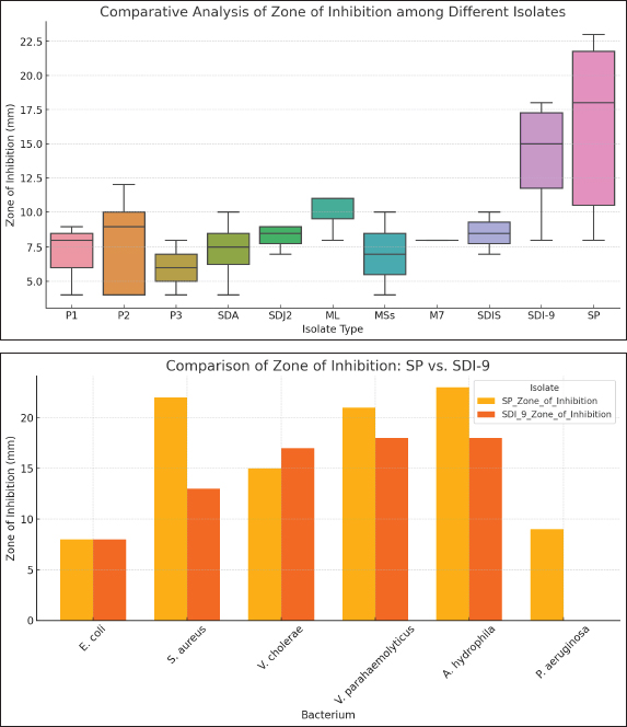 Fig. 5. Antibacterial activity of nanoparticles against isolated fish bacteria Spherical nanoparticles are also typically very large in surface area-to-volume ratio, meaning that a large proportion of the structure is visible to the environment. This surface area allows for more active spaces for chemical reactions such as metal ions to be adsorbed. When it comes to metal absorbents, a greater surface area means a greater ability to trap and extract metal contaminants from solutions. Aerodynamic nanoparticles easily transport and disperse metal ions into the adsorption locations on their surface. The shape of the ball lowers the diffusion coefficient and allows metal ions to easily pass through the sites of action. This is especially useful for fast adsorption. Moreover, spherical nanoparticles do not clump or settle like asymmetrical nanoparticles. Such stability keeps the active surface area available, and the nanostructure spreads out in the solution, which retains its adsorption capacity for a longer time (Rajalakshmi et al., 2022). In addition, spherical nanoparticles give you a sharp and facile to functional surface. There are functional groups, coatings, or ligands that can be directly attached to the sphere and used to tailor the interaction with specific metal ions or contaminants. Such multifunctional surface modifications make metal adsorption more selective and efficient (Molina et al., 2020). In summary, spherical nanostructures are very suitable for metal adsorption because of their high surface area, uniformity, mass transfer efficiency, stability, functionalization ease, scalability, and decreased risk of channeling or clogging. These properties make spherical nanostructures promising candidates for environmental and industrial applications such as the removal of heavy metals from water (Fig. 3). This consistency also means that after 15 minutes, the absorption is already in equilibrium, and more time incubation does not yield much-improved absorption. Taking all this into account, 15 minutes of incubation is the most time for the nano-absorbent to achieve optimum and consistent absorption. This important result provides the keys to many real-world scenarios in which efficient and time-sensitive metal ion removal is needed, for example, in water treatment and environmental remediation (Wu et al., 2022). In all Cd (II) solution concentrations tested, the absorption efficiency was low for the first 5 minutes of incubation. This is something we see a lot about adsorption because initially, the surface of the adsorbent may not be fully available or primed for adsorption. These results are in line with the view that there will be an initial phase of adsorption in which the adsorbent surface is “wetting” up with adsorbate molecules. However, perhaps most importantly, after 15 minutes of incubation, the absorption efficiencies shift markedly. The absorption efficiency reaches equilibrium regardless of the initial Cd (II) solution concentration. This means that 15 minutes is the time at which absorption becomes most efficient, and incubation longer will not improve much. Moreover, the quick arrival of equilibrium at 15 minutes is useful. For situations in which Cd (II) needs to be withdrawn rapidly from aqueous solutions, such as in water treatment and environmental cleanup, the AgNPs [at] TEOS [at] DA nanosorbent is of note. Because it reaches equilibrium in a short period of time and retains its absorption rate over time, metal ion removal is rapid and accurate. Conclusion: The yields derived from the time-dependence of incubation indicate that equilibrium was achieved quickly at 15 minutes. AgNPs [at] TEOS [at] DA can be considered a promising, effective Cd (II) sorbent nanosorbent. These results are consistent with general adsorption dynamics and with other research on the adsorption of heavy metal ions (Elkhatib et al., 2019). The acidity of a solution also affects the adsorption ability of the solution (Dil et al., 2017). As depicted in Figure 4B, one can see that the excretion of Cd (II) under low pH is significantly less effective than that above it. The amount of Cd (II) adsorbed was also much higher as the solution pH increased from 4 to approximately 6.0. It is caused by precipitation of Cd (II) as a precipitate of insoluble Cd (OH)2. In other words, when these pH values are higher than 6, the ions of Cd (II) start hydrolyzing to create microscopic amounts of cadmium hydroxyl species (Omidvar-Hosseini and Moeinpour, 2016). Further elaboration is required to explain the lack of metal adsorption observed in pH6 solutions, which can be explained by protonated AgNPs [at] TEOS [at] DA surfaces and electron repulsion and H+-Cd (II) competition for active sites. Throughout the pH range of 4 to 6, equilibrium Cd (II) ions absorbs are vastly improved because protonation decreases with increasing pH. This decrease also lowers the H+-Cd (II) competition for active sites; therefore, Cd (II) ions can be more readily taken up. However, as the pH of the solution increases above 7, the precipitation of Cd (II) ions, in the form of cadmium hydroxide, are precipitated (Da Conceição et al., 2021). Compared with Cd (II) ions, the newly generated species are less adsorbable and exhibit only a marginal decline in removal efficiency and adsorption. Therefore, the pH at which maximum absorption occurs was approximately 6.0. Thus, pH 6.0 was chosen as the reference condition for all of the following absorption experiments. It behaves in this way because it fits the Langmuir adsorption model and is normal for adsorption. At lower starting concentrations, there are plenty of empty adsorption zones for metal ions to hit the adsorbent. As the metal ions become concentrated, these sites become over occupied until saturated, which reduces the removal capacity (de Castro Alves et al., 2019). This is a reminder that choosing the right initial concentration of Cd (II) ions for the best removal ef