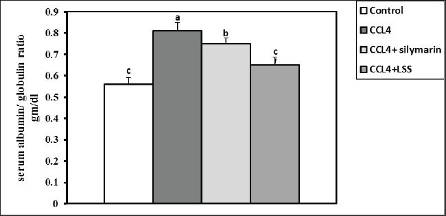 Fig. 4. Effect of LSS, CCL4 and Silymarin on serum albumin/globulin ratio gm/dl in male rat. a,b,c: columns labeled with different letters display significant variations (p<0.05).