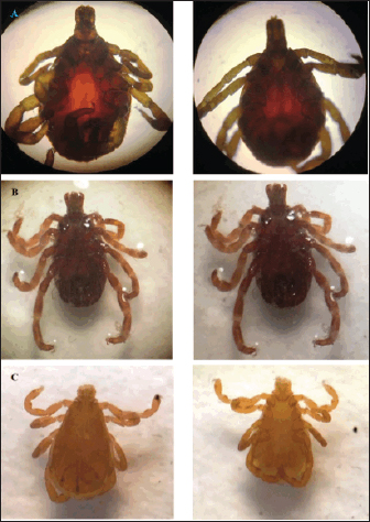 Fig. 2. Classification of study ticks based on its morphology. (A) Hylaomma anatolicum, (B) R. sanguineus, and (C) R. turanicus.