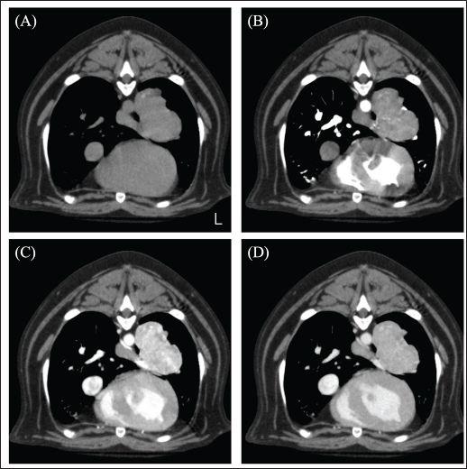Fig. 1. CT image of the chest. (A) Plain, (B) arterial phase, (C) venous phase, and (D) equilibrium phase. The mass was in contact with the left cranial lobe, was strongly contrast-enhanced in the venous phase, and rapidly washed out in the equilibrium phase.