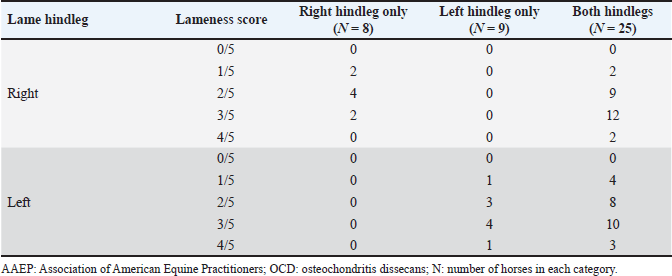 Among all orthopedic developmental diseases of horses, OC has the highest economic impact (Arrantes Baccarin et al., 2012), being the most prevalent cause of orthopedic impairment (Vos, 2008; Whitton, 2015). The process is triggered by early vascular damage leading to ischemic chondronecrosis and consequently disturbing the endochondral ossification (no new lesion can form after its completion), almost always at certain predilection sites within a joint (van Weeren, 2019). Even though the lesions develop focally, often more than a single joint is affected in the same animal. Thus, OC is considered today a developmental disease that occurs multifocally at specific predilection sites (Olstad et al., 2015). However, OC is a highly dynamic condition, and many of the lesions can heal as long as the extracellular matrix of the articular cartilage is still remodeling (van Weeren, 2019), with the ‘age of no return’ depending on the affected joint (Arrantes Baccarin et al., 2012) and the foal’s breed. According to Naccache et al. (2018), the most commonly affected articulations include the metacarpophalangeal or metatarsophalangeal (fetlock), tarsocrural (hock) and femoropatellar (stifle) joints, and the predilection sites are the dorsoproximal aspect of the sagittal ridge of the third metacarpal/metatarsal bone in the fetlock, the sagittal ridge of the distal tibia, the lateral and medial malleolus of the tibia, the lateral and medial trochlea and the basis of the talus in the hock, and in stifle joints the lateral and medial trochlea of the femur, and the sulcus intertrochlearis of the patella. The impact of physical factors on the occurrence of cartilage fragmentation (OCD) and other characteristic clinical signs (joint effusion with or without lameness) is in-contestable, as the typical OC/OCD patients are yearlings (at different ages according to breed) after the beginning of their training period. However, many cases fall outside this pattern, and diagnosing at any age, from young foals to horses over 10 years of age, is described (van Weeren, 2019). In our reference population of horses, the OCD lesions became clinically manifest at a later age of the patients than in many research reports, highlighting the impact of physical effort in triggering the clinical signs even later in the competitional career of the sport horse. The results of this preliminary study suggest that in horses with lameness caused by OCD, the data obtained with the Lameness detector 0.1 correlates well with the outcome of the subjective gait assessment performed by highly experienced evaluators. Considering its low cost and relative ease of use, the Lameness detector 0.1 could be useful especially for veterinarians at the beginning of their career, providing them with a method of complementing subjective gait assessment with objective data. The Lameness detector 0.1, a simple, relatively inexpensive, and easy-to-set-up quantitative lameness evaluation device, could thus be used as a screening tool at the beginning of the horse’s lameness examination, indicating if a more detailed assessment is needed. This preliminary study has a few limitations, the most important of which is the lack of comparison between the results obtained with the Lameness detector 0.1 and another, validated, objective gait assessment method. Based on the encouraging results reported here, we plan to further pursue the development of the Lameness detector 0.1 in studies that also include such comparisons. Another limitation is represented by the inclusion of measurements taken during five strides only; while in theory, a higher number of strides might be useful for decreasing inter-stride variability, we found that in the current setup, including more strides increased the chance of errors in data acquisition. In future studies, we also plan to improve data processing, allowing us to evaluate the number of strides associated with the best performance of the device. Lastly, we plan to explore the potential of using artificial intelligence to corroborate data gathered using the Lameness detector 0.1 and a video recording of the subjective lameness assessment procedure. ConclusionThe quantitative results obtained using the Lameness detector 0.1 device proved to be well correlated with lameness severity established according to AAEP guidelines in horses with tarsal OCD, with the best relevance obtained when considering the mean numbers of impulses measured on the X axis of the accelerometer. Considering its relatively low costs and ease of use, the Lameness detector 0.1 device can be used to complement subjective gait assessment and could prove especially useful for less experienced evaluators. AcknowledgmentsEditorial services were provided by Timea Kiss (c/o Cristian M. Crecan). Conflicts of interestThe authors declare no conflict of interest. FundingThis research received no external funding. Authors’ contributionsCristian Mihăiță Crecan: Conceptualization, Data Curation, Formal Analysis, Investigation, Methodology, Writing—Original Draft. Valeria Ciulu-Anghelescu: Conceptualization, Project Administration, Supervision, Validation, Writing—Review & Editing (Corresponding Author). Iancu Adrian Morar: Data Curation, Investigation, Resources, Visualization. Alexandru Florin Lupșan: Formal Analysis, Investigation, Software, Visualization. Mirela Alexandra Tripon: Investigation, Methodology, Writing—Original Draft. Denisa Bungărdean: Data Curation, Formal Analysis, Writing—Review & Editing. Zsofia Daradics: Data Curation, Supervision, Investigation. Cosmin Petru Peștean: Conceptualization, Investigation, Methodology, Supervision, Writing—Review & Editing. Data availabilityAll data generated or analyzed during this study are included in this published article. ReferencesAAEP. 2024. Lameness exams: evaluating the lame horse. Lexington, KY: American Association of Equine Practitioners [Internet]. Available via https://aaep.org/