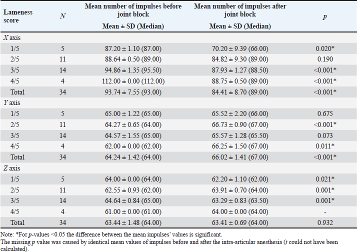 Comparisons between the mean number of impulses recorded before and after the joint block in horses with lameness of the right hindleg are presented in Table 2. The mean number of impulses on the X axis showed a significant decrease (p < 0.001) between the pre- and post-joint anesthesia values for the overall group and for horses with scores of 3/5 on the AAEP scale, a sign of gait improvement. On the Y axis, the differences were significant (p < 0.05) overall and for the horses scoring 2/5 and 3/5 on the AAEP scale, but in these instances, the number of the impulses increased as the lameness decreased in the assessed (right) leg. The Z axis showed less specificity with regard to the significance of the joint-block effect. The mean number of the recorded impulses decreased when the gait improved, showing statistical significance (p < 0.01) only for the horses with 3/5 scores on the AAEP lameness scale in their right hindleg. Table 3 shows the comparisons between the mean number of impulses recorded before and after the joint block in the horses with lameness of the left hindleg. After the joint block, horses with left hindleg lameness presented a statistically significant (p < 0.05) decrease of the mean number of impulses recorded on the X axis; this change was observed in the overall group and in the horses scoring 1/5, 3/5, and 4/5 on the AAEP lameness scale (Table 3). On the Y axis, the number of impulses increased post-anesthesia, compared with the assessment before the joint block. For the horses with a 4/5 score for left hindleg lameness the difference was significant at a p < 0.05, while for the overall group and the horses scoring 2/5, the difference was even more significant (p < 0.001). The analysis of the Z axis values showed decreased values for the mean number of impulses after joint anesthesia for the horses scoring 1/5 and 3/5 on the lameness scale but increasing values in the assessment of the horses having a score of 2/5. The p-values were highly significant (p=0.001) when the impulses were compared between pre- and post-joint anesthesia in the horses scoring 2/5 and 3/5. The standard deviations reported in Tables 2 and 3 show that the recoded values were clustered relatively tightly around the means, suggesting that the precision of the device is high. Although subjective lameness assessment is widely performed all around the world, it is increasingly considered less reliable than objective movement evaluation, especially for detecting subtle movement asymmetries; in addition, the latter method also avoids interobserver disagreement (Müller-Quirin et al., 2020). Among the kinematic methods, the IMUs appear to be a promising cost-effective, and practical solution in clinical practices. In our study, the results obtained with the Lameness detector 0.1 were in line with the lameness scores established according to the AAEP guidelines in the studied OCD patient horses. The post-joint block evolution of the values recorded with the Lameness detector 0.1 device on the X axis was also generally aligned with the changes in the AAEP lameness scores. As the first three tables show, the difference between the pre- and post-anesthetic mean number of impulses on all axes tended to be higher as the lameness grade increased, suggesting that the Lameness detector 0.1 could be more useful in assessing more severe lameness. In such cases, the subjective lameness evaluation is usually more accurate as well, even when performed by less experienced veterinarians. The mean number of impulses on the X axis of the Lameness detector 0.1 proved to be the most in line with the lameness score established using subjective evaluation. The values recorded on the Y and Z axes are important in the diagnostic too, but only in correlation with the values observed on the X axis. The mean number of the impulses recorded on each axis of the accelerometer was found to be the more certain element in establishing the lameness degree. These values and their change under the influence of intra-articular an-esthesia followed the tendency shown by the subjective gait-assessment scores. In all cases, the mean number of impulses recorded on the X axis decreased after the joint block and those on the Y axis increased (Tables 2–5). The explanation for this finding was related to the function of the accelerometer incorporated in our device. A three-axis accelerometer measures the acceleration in relation to the three Cartesian coordinate axes. These axes are linked to themselves and fixed, thus the reference system for the tool is itself, meaning that if the accelerometer is rotated, the orientation of the axes changes. Because of the position of the Lameness detector 0.1, the impulses on the X axis were recorded in the swing phase of the foot, during its forward movement. The increase recorded on the Y axis showed a longer vertical movement of the lame leg, the horses avoided the touch of the foot to the ground, and the more that the pain felt was more intense. On the Z axis, the lateral movements were recorded, and the mean number of impulses on this axis had not been consistent with the lameness degree (Tables 2 and 3). Table 2. Mean (± SD) and median values of the impulses recorded by the Lameness detector 0.1 in the right hindleg of the horses presenting lameness in that leg (N=33), assessed before and after intra-articular anesthesia.