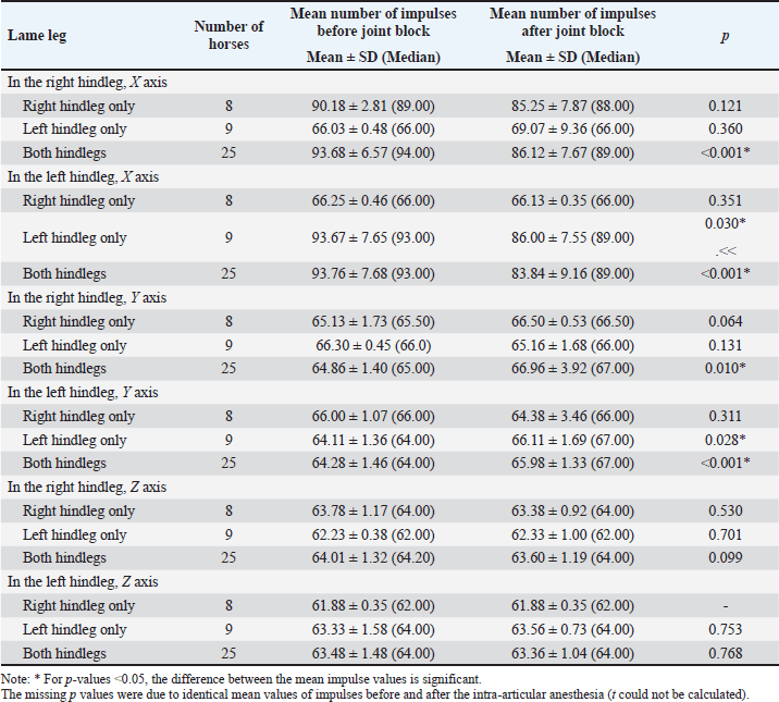 Table 4 synthetizes the direction of variation in the mean numbers of Lameness detector 0.1 impulses on its three axes in the horses for which statistically significant differences were observed between the pre- and post-joint block gait assessments. In order to better understand the direction of these variances and the cause of the mean impulse numbers increasing after the joint-anesthesia compared with the mean numbers obtained during the pre-anesthesia assessment, we compared pre- and post-joint block values separately for horses that were lame only in their right hindleg, only in their left hindleg, or in both their hindlegs, regardless of their AAEP score (Table 5). In the horses presenting lameness exclusively in their right hindleg, the mean number of the impulses did not differ significantly when we compared the pre-joint block and the post-joint block values, on either of the axes. In the horses presenting lameness exclusively in their left hindleg, these values varied significantly (p < 0.05) after the joint block compared with their initial values on both the X and Y axes, decreasing on the first and increasing on the latter, respectively. The horses with bilateral hindleg lameness presented a similar tendency to those with left hindleg lameness, with a significant decrease of the mean number of impulses on the X axis (p < 0.001) and an increase on the Y axis (p=0.01), recorded after the joint block. Table 3. Mean (± SD) and median values of the Lameness detector 0.1 recorded impulses in the left hindleg of the horses presenting lameness in that leg (N=34), assessed before and after intra-articular anesthesia.