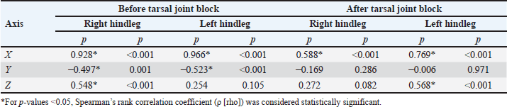 In order to explore the relationship between the mean number of impulses recorded by the Lameness detector 0.1 and the AAEP lameness score of the studied horses, correlations were calculated for each hindleg, before and after performing the intra-articular anesthesia of the tarsal joint (Table 6). Table 5. Comparisons of the mean values of the impulses recorded by the Lameness detector 0.1 on its three axes according to the lame hindleg of the assessed horses, regardless of their lameness scores, before and after intra-articular anesthesia.