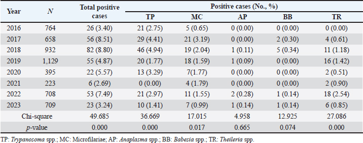 AbstractBackground: Hemoparasitic infections significantly threaten cattle health globally, leading to economic losses and welfare issues for farmers. Aim: This retrospective study aimed to investigate the prevalence and associated factors of hemoparasitic infections in fighting bulls in southern Thailand over an 8-year period. Methods: Laboratory records of 5,518 bulls from the Livestock Animal Hospital, Faculty of Veterinary Science, Rajamangala University of Technology Srivijaya, were reviewed for the period January 2016 to December 2023. Blood samples were analyzed using thin blood smear methods to identify hemoparasites, and packed cell volume was measured using the microhematocrit method. Detailed profiles and demographic data for each animal were recorded. Results: Among the fighting bulls, 323 (5.85%) tested positive for hemoparasitic infections, with five hemoparasites identified: Trypanosoma spp. (TP), Microfilariae, Anaplasma spp. (AP), Babesia spp. (BB), and Theileria spp. (TR). TP was the most prevalent at 2.90%. Bulls aged 1–5 years showed the highest infection rates at 7.04%, with a decline in infections as age increased. Annual trends peaked in 2018 at 8.80%, with significant yearly fluctuations for most parasites (p < 0.05) except AP and BB. Monthly analyses revealed the highest infection rates in March, particularly for TP, with significant monthly variations for TR (p < 0.05). Geographical differences in infection rates between the East and West coasts were minor and not statistically significant. However, seasonal variations were significant for BB and TR on the east coast during summer (p < 0.05). Bulls with PCV below 30% had a higher prevalence of hemoparasitic infections (8.06%) compared to those with PCV above 30% (5.87%), with significant differences in the prevalence of AP and TR infections (p < 0.05). Conclusion: This study adds to the understanding of hemoparasite infections in bulls, informing the development of educational materials for farmers and ultimately empowering them to make better herd health decisions. Keywords: Blood parasite, Prevalence, Indigenous cattle, Bull, Epidemiological factors. IntroductionHemoparasitic infections in cattle are critically important due to their significant impact on livestock health, productivity, and the broader agricultural economy (Heylen et al., 2023). Infections caused by protozoan and rickettsial parasites such as Babesia (BB), Theileria (TR), Anaplasma (AP), and Trypanosoma (TP) species can lead to diseases with varying severity, manifesting as anemia, fever, weight loss, and sometimes death (Tefi et al., 2015; Julie et al., 2021). Morbidity rates for hemoparasitic infections in cattle can be as high as 90%, with mortality rates ranging from 10% to over 50%, influenced by the parasite species, cattle breed, and local conditions (Swai et al., 2009; Khan et al., 2021). These parasites are predominantly transmitted by ticks, with various tick species acting as vectors for different hemoparasites (Yitayew and Samuel, 2015). The economic impact is considerable, encompassing reduced meat and milk production, increased veterinary expenses, and potential trade restrictions (Strydom et al., 2023). The prevalence of hemoparasitic infections in cattle varies widely across regions, especially in tropical areas (Ferraz da Costa et al., 2014; Jirapattharasate et al., 2017; Dharanesha et al., 2017). This variability is influenced by factors such as climate, vector presence, management practices, and host immunity (Maharana et al., 2016; Weny et al., 2017). Fighting bulls, indigenous cattle in southern Thailand, are selected for bullfighting due to their superior physical attributes, including body conformation, skin pigmentation, horn structure, aggressive behavior, and proficient fighting skills. This culturally significant sport has grown in popularity, attracting tourists and boosting local economies (Mhonghong et al., 2019; Chodchaey et al., 2022). Bulls chosen for competitions typically undergo rigorous training and conditioning from the age of 4–5 years, involving daily walks of 5–10 km and monthly sparring sessions to achieve peak physical fitness (Mhonghong et al., 2019; Chodchaey et al., 2022). Given their high value, effective health monitoring and management are crucial for ensuring the robustness and enhancing the fighting capabilities of these bulls. Hemoparasitic infections in beef and dairy cattle in Thailand have been extensively investigated, revealing the presence of various hemoparasites, including BB, TR, and AP, in the central, western, and northern regions of the country. High incidences of these infections are reported in areas with dense cattle populations (Kaewthamasorn and Wongsamee, 2006; Jirapattharasate et al., 2017; Srionrod et al., 2022; Koonyosying et al., 2022). A previous study reported a 42.50% prevalence of hemoparasitic infections in fighting bulls (Keawchana et al., 2021). However, limited knowledge exists on hemoparasitic infections in fighting bulls, particularly regarding their prevalence, temporal patterns, and potential risk factors. This study aimed to address this gap by investigating the prevalence and temporal dynamics of these infections in fighting bulls from southern Thailand over an 8-year period. Additionally, it sought to identify and analyze factors associated with these infections within this unique population, with the aim of improving individual and herd health management practices. Materials and MethodsStudy areaBlood samples were collected from fighting bulls at the Large Animal Hospital (or relevant department) within the Faculty of Veterinary Science, Rajamangala University of Technology Srivijaya (RUTS), Nakhon Si Thammarat campus, located within the latitudinal range of 5°–12° North and longitudes 98°–103° East. These bulls originated from various regions across southern Thailand. The region experiences a tropical monsoon climate with a longer rainy sea