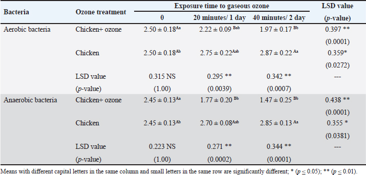 Table 3. Effect of O3 gas on the total aerobic and anaerobic bacterial counts (log CFU/g) of non-inoculated chicken meat with A. butzleri during storage at 3°C–7°C.