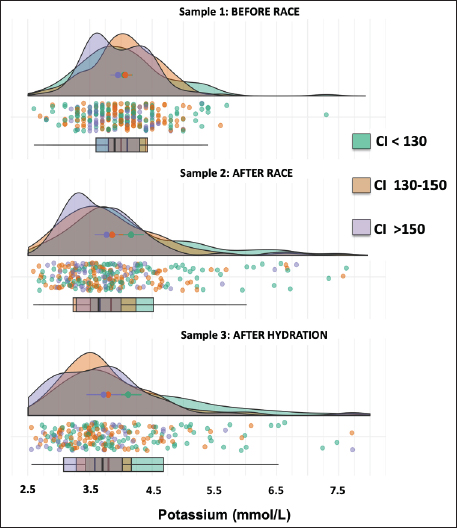 Fig. 6. Individual potassium values (dots) and normal distribution of potassium concentrations in sample 1 (before the race), sample 2 (after the race), and sample 3 (after rehydration). Different colors represent CI. The box and whisker plot show the median, upper and lower quartiles, and individually values. AcknowledgmentsThe authors would like to acknowledge the Federación Ecuestre Uruguaya (FEU), Supra, Laboratorio Ripoll (Uruguay), Pedro Martino, Elizabeth Pechiar, Carlos Soto, and the veterinarians and students who collaborated in the field study. Conflict of interestThe authors declare that there is no conflict of interest. Authors’ contributionsConceptualization, G.M.; methodology, G.M.; formal analysis, G.M. and G.S.; writing—original draft preparation, G.M.; writing—review and editing, M.M., A.M., and G.S. All authors have read and agreed to the published version of the manuscript. FundingThis research received no external funding. Data availabilityAll data are provided in the manuscript. ReferencesBennet, E. D. and Parkin, T. D. H. 2018. Fédération Equestre Internationale endurance events: risk factors for failure to qualify outcomes at the level of the horse, ride and rider (2010–2015). Vet. J. 236, 44–48. Bernardi, N. S., Gomide, L. M. W., Antunes, A. D., Gravena, K., Dias, D. P. M., Queiroz, D. J., Canello, V. A., Silva, A. M. G. B., Brandi, R. A. and Lacerda-Neto, J. C. 2018. Equilíbrio ácido-base e hidroeletrolítico em equinos submetidos à simulação de enduro FEI. Arquivo Brasileiro de Medicina Veterinaria e Zootecnia, 70(2), 359–367. Bonilla, J. 2005. Respuesta hematológica al ejercicio. Revista de Ciencias de la Salud, 3(2), 206–216. Carlson, G. P. 1975. Hematologic alterations in endurance-trained horses. In Proceedings of the First International Symposium on Equine Hematology, Lansing, MI, pp: 473. Carlson, G. P. and Ocen, P. O. 1979. Composition of equine sweat following exercise in high environmental temperatures and in response to intravenous epinephrine administration. J. Equine Med Surg. 3, 27. Carlson, G. P. 1987. Hematology and body fluids. In Gillespie JR, Robinson NE (eds): Equine exercise physiology 2. Davis, CA: ICEEP Publications, pp: 393. Corley, K. and Stephen, J. 2008. Appendix: haematology, biochemistry and electrolytes. In The Equine Hospital Manual. Corley, K. and Stephen, J. Eds., Hoboken, NJ: John Wiley and Sons, pp: 654–689. Ecker, G.L. 1995. Fluid and ion regulation: a primer on water and ion losses during exercise. Equine Vet. Educ. 7, 210. F.E.U. 2021. Reglamento Actual General de Raid de La Federación Ecuestre Uruguaya. Available via http://www.federacionecuestreuruguaya.com.uy/documentacion.html Fielding, C. L., Magdesian, K. G., Rhodes, D. M., Meier, C. A. and Higgins, J. C. 2009. Clinical and biochemical abnormalities in endurance horses eliminated from competition for medical complications and requiring emergency medical treatment: 30 cases (2005-2006). J. Vet. Emerg. Crit. Care (San Antonio), 19(5), 473–478. Fielding, C. L., Meier, C. A., Balch, O. K. and Kass, P. H. 2011. Risk factors for the elimination of endurance horses from competition. J. Am. Vet. Med. Assoc. 239(4), 493–498. Flaminio, M. J. and Rush, B. R. 1998. Fluid and electrolyte balance in endurance horses. Vet. Clin. North. Am. Equine Pract. 14(1), 147–158. Foreman, J. H. 1998. The exhausted horse syndrome. Vet. Clin. North Am. Equine Pract. 14(1), 205–219. Hodgson, D. R., McCutcheon, L. J., Byrd, S. K., Brown, W. S., Bayly, W. M., Brengelmann, G. L. and Gollnick, P. D. 1993. Dissipation of metabolic heat in the horse during exercise. J. Appl. Physiol. 74(3), 1161–1170. Jones, S. 2009. Horseback riding in the dog days. Animal Science e-News, 2, 3-4. Available via http://www.uaex.edu/farmranch/animals-forages/docs/ansc%20e-news%20july2009.pdf (Accessed 12 December 2013). Lindinger, M. I. 2008. Sweating, dehydration and electrolyte supplementation: challenges for the performance horse Proceedings of the 4th European Equine Health and Nutrition Congress, The Netherlands, April (18-19). Marichal, G., Trigo, P., Soto, C., Meikle, A. and Suárez, G. 2023. Hydroelectrolytic and acid–base parameters after 80 to 115 km endurance races (Raid Uruguayo) and Their Association with the Comfort Index. Animals, 13(4), 670. Marlin, D.J., Scott, C.M., Schroter, R.C., Mills, P.C., Harris, R.C., Harris, P.A., Orme, C.E., Roberts, C.A., Marr, C.M., Dyson, S.J. 1996. Physiological responses in nonheat acclimated horses performing treadmill exercise in cool (20 _C/40%RH), hot dry (30 _C/40%RH) and hot humid (30 _C/80%RH) conditions. Equine Vet. J. 28, 70–84. McCutcheon, L.J. and Geor, R. J. 1998. Sweating sweating: fluid and Ion losses and replacement. Vet. Clin. North Am. Equine Pract. 14(1), 75–95. Muñoz-Alonzo, L., Silva, A. B., Leal, J. C. and Luengo, M. B. 2016. Motivos de Eliminación en Competencias de Enduro Internacional, Categoría Jinete Adulto, en Chile (2007-2014). Rev. Investig. Vet. Perú. 27(2), 259–266. Nagy, A., Murray, J. K. and Dyson, S. 2010. Elimination from elite endurance rides in nine countries: a preliminary study. Equine Vet. J. Suppl. (38), 637–643. Nagy, A., Murray, J. K. and Dyson, S. J. 2013. Descriptive epidemiology and risk factors for eliminations from Fédération Equestre Internationale endurance rides due to lameness and metabolic reasons (2008–2011). Equine Vet. J. 46(1), 38–44. Nyman, S., Jansson, A., Dahlborn, K. and y Lindholm, A. 1996. Strategies for voluntary rehydration in horses during endurance exercise. Equine Vet. J. 22, 99–106. Poškienė, I., Juozaitienė, V., Gruodytė, R. and Antanaitis, R. 2020. The effect of 60 km endurance exercise on serum electrolytes and acid–base balance in the Žemaitukai horses. Acta Veterinaria Brno, 89(2), 125–131. Robert, C., Goachet, A., Fraipont, A., Votion, D., Van Erck, E., Leclerc, J. 2010. Hydration and electrolyte balance in horses during an endurance s
