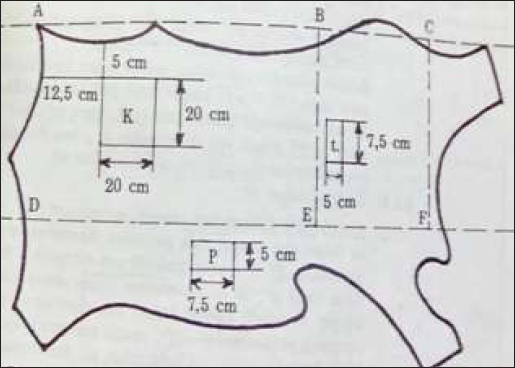 Fig. 1. Place retrieval example test (SNI 06-0463-1989) (1989a). In this case, the chemical materials used are H2SO4 (concentrated sulfuric acid) 1.5%, NaCl 10%, Za 0.5%, teepol (soap) 1%, or open 0.5%, FA (formic acid) 1%, Na2S 2%, n atrial bicarbonate 2.5%, sodium carbonate (Na2CO3) 0.5%, Ca(OH)2 (quicklime) 6%, anti-fungal (preventol) 0.02%, and water 1280%. Rumen fluid, granulated sugar, and coconut water. The percentage was calculated by skin weight. Furthermore, the equipment used includes tanning drums, scales, pH meter, digital scales, knife stainless steel, basin, rope raffia, frame for stretching, tensile strength tester, lactometer, thickness gauge, caliper, glass measuring, ruler, pencil, scissors, board runway for throwing away meat, and scissors stainless steel. Design studyThis study used an experimental method with a completely randomized design consisting of five treatments and four replications. The treatment uses rumen fluid IMO as much as 33% from heavy skin with the immersion length: A=0 days (control), B=1 day, C=2 days, D=3 days, and E=4 days. The data were also analyzed using SPSS. Place retrieval example testThe place-taking example test is shown in Figure 1. Observed parametersThe parameters observed are the physicochemical and sensory of tanned leather. The physicochemical parameters were tensile strength test, elongation test, Zwik strength test, moisture content, oil/fat content, water-soluble substance content, rawhide content, insoluble ash content, bound tanning substances (tannins) content, and degree of tanning (SNI 06-0463-1989a). The leather was cut with a knife or scissors for chemical tests into small pieces measuring (5 x 5) mm2, as presented in Figure 1. The leather was then mixed evenly (homogeneous). The test sample was also used. Sensory value testing was conducted by spreading the leather on a table with the nerf part above, then observed with the five senses (SNI 0463-1989a), with several moderately trained panelists from 25 people. The serving was carried out by giving random samples to the panelists, who were not allowed to repeat the assessment or compare the samples presented. Then the panelists were asked to fill out a numeric scale form according to the scale given: meat section observed the remaining meat (1=meaty, 2=slightly meaty, 3=clean from meat), leather condition, observed by holding (1=stiff, 2=quite limp, 3=limp), nerf or rajah color (1=brownish yellow, 2=reddish brown, 3=brown), nerf or rajah section, held the nerf surface (1=rough, 2=slightly slippery, 3=slippery). Implementation studyThe process of removing tanned leather hair using rumen fluid (IMO) consists of the following stages: IMO fermentation includes fermented sugar, rumen fluid, and coconut water with a ratio of 1:2:10 for seven days in facultative anaerobes condition (G1); next is making second generation (G2), i.e., IMO liquid, coconut water, and sugar with a ratio of 1:5:0.5 for four days Tan goat leather includes soaking wet salt-preserved leather in a container with an amount of water ten times the weight of the leather; after, soaking the skin in IMO solution with a concentration of 33% and 6% quicklime, for zero until three days (appropriate treatment); throw away flesh and fur, neutralize skin, scraping protein and fat, pickling using H2SO4, adding anti-fungal, tanning leather with 25% gambier, washing the resulting skin with water, and drying the tanned leather with indirect sunlight. Table 1. Physical properties of gambier-tanned goat leather.