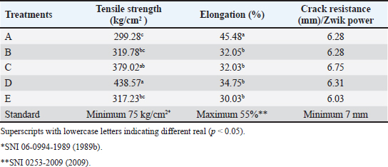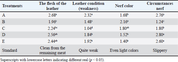 Ethical approvalThis study did not use animals directly; it only used dried salt-preserved goat skin, and the sensory analysis was only visual; therefore, there was no ethical approval. ResultsPhysical characteristics of gambier-tanned goat leatherThe analysis results for gambier-tanned goat leather demonstrate that the dehairing process using different immersion times in rumen fluid IMO affects the pulling strength and elongation. However, there was no influence on the cracking strength Table 1. The longer the soaking time, the gambier-tanned goat leather in the rumen fluid IMO solution increases the dragging strength and decreases the gambier-tanned goat leather elongation. Table 1 shows that the average tensile strength test with the treatments of adding IMO had the highest soaking time in treatment D (three days soaking), while the lowest tensile strength was found in treatment A (control). This standard is based on the SNI (1989b), with a minimum standard of 75 kg/cm2. The subsequent Duncan’s test analysis revealed that treatment A exhibited statistically significant differences compared with treatments C and D. However, no substantial disparities were observed between treatments A, B, and E. The average mark test revealed that the highest elongation of gambier-tanned goat leather was observed in treatment A (control). Meanwhile, the lowest tensile strength was observed in treatment E (4 days). Duncan’s test results showed that treatment A exhibited significant differences compared with treatments B, C, D, and E. Crack resistance (mm)/Zwik power with the addition of rumen fluid IMO against the old immersion range between 6.03 and 6.75 mm. Chemical characteristics of gambier-tanned goat leatherGambier-tanned goat leather shows its diverse influence on raw substance skin, grade substances late in water, and degree of tanning. However, no significant effect was observed, ash fat levels were not dissolved, and tannin was bound to Table 2. The average moisture content of vegetable tanning, with the addition of rumen fluid IMO, during the dehairing of goat leather was 14.83%–15.59%. The difference in the addition of IMO to the moisture content was influenced by the condition of the leather itself, where each treatment had the same ability to hydrolyze globular proteins, most of which were left only fiber proteins (collagen), where this collagen tissue did not bind much water. The average fat content of vegetable tanning with the addition of rumen fluid IMO during dehairing of goat skin was the highest in treatment E, 1.04%, and the lowest in treatment A, 0.86%. Water-soluble substance levels are a way to determine the amount of tannin that is not bound or filled too much with objects easily dissolved in water in the tanned leather. The highest levels of water-soluble substances were observed in treatment E, whereas the lowest levels were observed in treatment B. Duncan’s further test results showed that the levels of soluble substances in vegetable tanning water with gambier in treatment A (control) were significantly different from those in treatments B, C, and D but not significantly different from those in treatment E. The high levels of soluble substances in treatment E, with an average of 17.94%, were influenced by the duration of hide immersion in IMO-enriched rumen fluid during the depilation phase, causing the skin tissue structure to be more open but damaged by microbes so that the tanning agent that entered had not penetrated properly to form bonds with collagen fibers in goat skin so that some tannin content in gambier did not bind to the leather and dissolved into water. Gambier-tanned goat leather’s average insoluble ash content was 0.32%–0.41%. The average level of bound tannin in vegetable tanning with the addition of rumen fluid during dehairing was 11.41%–14.14%. The insignificant effect of the bound tannin level is due to the sum of the water, rawhide, fat, seawater, and insoluble ash levels, which were statistically the same. The tanning degree of gambier-tanned goat leather was 19.72%–25.94%. Duncan’s further test results showed that the degree of tanning in vegetable tanning with gambier treatment A (control) was not significantly different from treatments B, C, and E but was significantly different from treatment D. Table 2. Chemical properties of gambier-tanned goat leather.