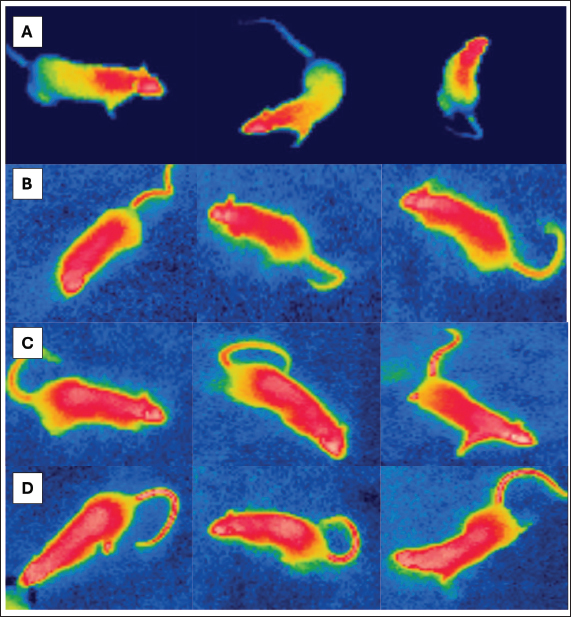 This study addressed the thermodynamic impacts on rats of sustained exposure to LTE radiation at 850, 1800, and 2600 MHz. Awareness of the influence of heat of RF waves with bands that go from three KHz to 300 GHz will be easier through thermographic visualization (McNamee and Chauhan, 2009; Nylund, 2011). A disparity in the physique’s thermal regulation system (heat production and heat dissipating), heat generation computed with SAR, and the energy level of an emitted device—which inappropriately exceeds 100 mW per cm2—all trigger a rise in tissue temperature. Three basic pathways govern heat loss: emission to the environs, convective in circulation, and transfer of heat to adjacent tissues (Hamada et al., 2011). Producing heat in a living system takes place as EMR engages with biological materials. This arises when it is absorbed and transmitted to the tissues, and the mechanism of absorption includes heating up, vibrating, rotating, and powered modes (Krewski et al., 2007). The quantity of radiation being absorbed, which is directly dictated by how fast and how long of exposure, impacts the level of excitement induced by biological tissue. Considering it may preheat tissues or hamper cellular activity and expansion, frequency is an essential element in the formation of heat (Güler et al., 2012). There are basically two stages to the thermolytic response of rats to chronic heat stress. The first action is cutaneous vasodilation from exposed vascularized surfaces, typically the hind end, in anticipation of temperature changes with the surrounding environment. Grooming carries out is a subsequent response(Stricker and Hainsworth, 1971). The infrared studies further proved that exposed animals had higher peak and lowest temperatures in various body regions than did unexposed animals. The thermographic spectrum illustrates how the disparity in animals exposed to EMR over an extended period of time (either through high use or chronic exposure) are quite clear, via hot regions scattered over the rats’ bodies. Our results refute a previous paper that Pelletier and associates published. They discovered exposed animals’ tail temperatures were less than those of unexposed animals. They placed the antenna in close vicinity to the exposed rats’ boxes, close to 80 cm distant, and applied low-intensity radiofrequency electromagnetic field continuous waves (900 MHz) (Pelletier et al., 2014). Nevertheless, the study’s findings complied with the data issued by the Usman team. who ultimately came to the view that, in lieu of the control group, animals exposed to 2.46 GHz for 7 hours a day for 4 weeks had higher body temperatures tracked by IRTC appliances, greater excretory rates, and were less active (Usman et al., 2011).
