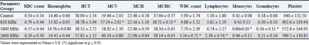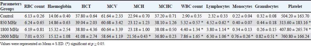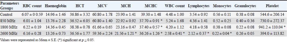 Table 2. Effect of LTE 850, 1800 and 2600 MHz exposure for 4 weeks on haematological values.