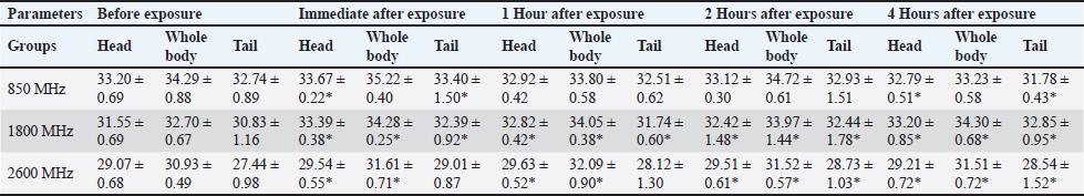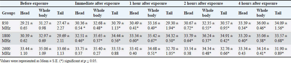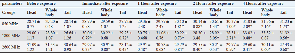For the 1800 MHz group, Significant temperature increases were observed immediately after exposure (32.51°C ± 0.46°C, 35.65°C ± 0.37°C, 34.44°C ± 0.56°C) and remained elevated up to 4 hours post-exposure (p < 0.05). For the 2600 MHz group, post-exposure temperatures showed a significant rise immediately (33.75°C ± 0.37°C, 35.40°C ± 0.27°C, 33.53°C ± 0.88°C) and continued to show significant increases at 1 and 4 hours (p < 0.05). Table 6 details the thermographic analysis of subjects exposed to LTE frequencies of 850, 1800, and 2600 MHz for 4 weeks, with temperatures measured at the head, whole body, and tail. For post-exposure of the 850 MHz Exposure group, temperatures increased significantly across all time points, with immediate post-exposure readings at 28.41°C ± 0.57°C, 30.39°C ± 0.50°C, and 27.69°C ± 1.58°C (p < 0.05). For 1800 MHz Exposure, significant temperature increases were noted immediately after exposure and persisted up to 4 hours (p < 0.05). For 2600 MHz Exposure, significant rises in temperature were recorded at all time points post-exposure (p < 0.05). Table 7 shows the thermographic analysis for subjects exposed to LTE frequencies of 850, 1800, and 2600 MHz for 6 weeks, with temperatures recorded at multiple time intervals. For 850 MHz Exposure, significant increases were seen immediately post-exposure, with the head temperature at 33.67°C ± 0.22°C (p < 0.05). For 1800 MHz Exposure, post-exposure temperatures showed significant increases at all time points (p < 0.05). For 2600 MHz Exposure, post-exposure measurements showed significant increases immediately and up to 4 hours post-exposure (p < 0.05). Table 8 summarizes the thermographic analysis for subjects exposed to LTE frequencies of 850, 1800, and 2600 MHz for 8 weeks, with temperature data collected before and after exposure. For 850 MHz Exposure, significant temperature increases were recorded, with the immediate post-exposure head temperature at 28.79°C ± 0.58°C (p < 0.05). For 1800 MHz Exposure, significant increases were observed immediately and at subsequent time points (p < 0.05). For 2600 MHz Exposure, significant increases were noted immediately post-exposure and persisted at later time points (p < 0.05) (Fig. 2). DiscussionThe current findings highlight significant hematological changes induced by long-term exposure to LTE frequencies of 850 MHz, 1800 MHz, and 2600 MHz. A previous work stated that RF-EMF affects negatively on hematological values at a frequency of 2.45GHz indicating that this effect is directly related to the altered frequency at a high range (Vijayalaxmi et al., 2001). Other studies found that both 0.9 and 1.8GHz exposure leads to significant changes in Hb, and RBC total count in exposed animals in respect to control animals (Dasdag et al., 2003; Trošić et al., 2012). Table 5. Thermographic image analysis of exposure to LTE 850, 1800 and 2600 MHz for 2 weeks.