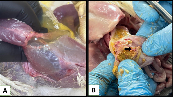 Fig. 2. Gross picture of chicken infected with mycotoxins (A): liver appears pale, enlarged, and brittle with petechial hemorrhage. (B) chicken kidneys appear pale, enlarged pale, enlarged, and hemorrhagic. Table 2 illustrates the results, which showed a significant increase in the means of AST, ALT, and uric acid in the infected chicken group recorded 44.48 IU/ml, 23.4 IU/ml, and 9.29 mg/dl, respectively, in comparison to the means values recorded in the healthy chicken group (41.35 IU/ml, 20.95 IU/ml, and 7.61 mg/dl). The results also showed a significant decrease in the means values of total protein and cholesterol in the infected chicken group (2.56 g/dl and 86.3 mg/dl, respectively) in comparison with the means values recorded in the healthy chicken group (3.5 g/dl, 188.7 mg/dl, respectively) (Table 3). DiscussionMycotoxins are known to be a prevalent secondary fungal metabolite contaminant in feed stuffs produced by mold and to be a substantial global issue with significant economic impact (Pappas et al., 2016). The Food and Agriculture Organization has indicated that about 1 billion metric tons of feed is destroyed annually throughout the world due to contamination with mycotoxins. This organization has estimated that 25% of agricultural crops that are used in the manufacture of feed and food products around the world are contaminated with mycotoxins.