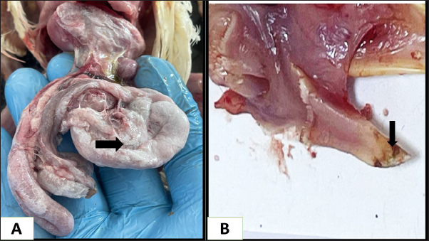 Fig. 4. Gross picture of the chicken infected with mycotoxin (A) visceral organs showing accumulation of urate crystals. (B) chicken tongue of showing severs ulceration. There have been reports of mycotoxins in poultry feed all over the world, which pose a serious risk to the wellbeing and output of chickens (Morrison et al., 2017; Ma et al., 2018). The problem of mycotoxicosis in Iraqi conditions, is one of the common problems that occur in chicken fields due to the lack of modern technology used in drying yellow corn, especially when harvesting the fall corn, which coincides with the period of rainfall and high humidity, and this exposes it to the growth of molds that secrete their toxins on yellow corn, when such grains are introduced into the feed, it will cause mycotoxicosis (Ibrahim and Al-Jubouri, 1986).
