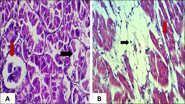 Fig. 5. Histopathological section of chicken infected with mycotoxin (A): kidney showing sloughing in the epithelia lining the renal tubules due to necrosis (black arrow) and collapse of glomeruli (red arrow) (B): chicken heart showing atrophy of myocardial muscles (red arrow) due to infiltration of inflammatory edema (black arrow) (H &E, stains, 400x).