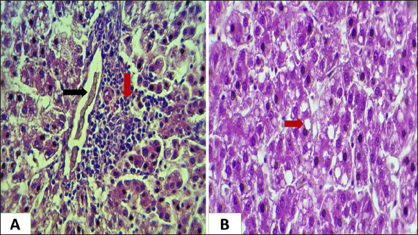 Fig. 6. Histopathological section for chicken liver infected with mycotoxin (A): showing congestion of the portal vein (black arrow), periportal necrosis with inflammatory cells infiltration (red arrow). (B): showing fatty-like change or vacuolation of hepatocyte (red arrow) (H &E, stains, 200x). The results of this investigation referred to that 22% of the food samples were contaminated with mycotoxins in different types (OTA, trichothecene T-2 toxin) where this percentage consisted of 12%, 8%, and 2% for AF, ochera toxin, and trechothesen T2, respectively. These results are nearly similar with results obtained by Hegazy et al. (2022) who was detected positive mycotoxin in feed sample (26%), representing (15.4%) AF and (11.5%) OTA.