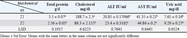 Table 3. Explain the mean ± st. error of total protein, TC, AST, ALT, and uric acid in mycotoxicosis chickens group and healthy chickens group.