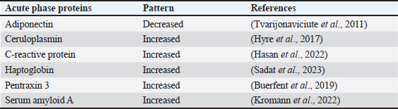 Open Vet. J.. 2024; 14(10): 2539-2550 Open Veterinary Journal, (2024), Vol. 14(10): 2539-2550 Review Article Acute phase proteins patterns as biomarkers in bacterial infection: Recent insightsAmer Al Ali1 and Wageh Sobhy Darwish2*1Department of Medical Laboratory Sciences, College of Applied Medical Sciences, University of Bisha, Bisha, Saudi Arabia 2Department of Food Hygiene, Safety and Technology, Faculty of Veterinary Medicine, Zagazig University, Zagazig City, Egypt *Corresponding Author: Wageh Sobhy Darwish. Department of Food Hygiene, Safety and Technology, Faculty of Veterinary Medicine, Zagazig University, Zagazig City, Egypt. Email: wagehdarwish [at] gmail.com Submitted: 03/08/2024 Accepted: 07/09/2024 Published: 31/10/2024 © 2024 Open Veterinary Journal