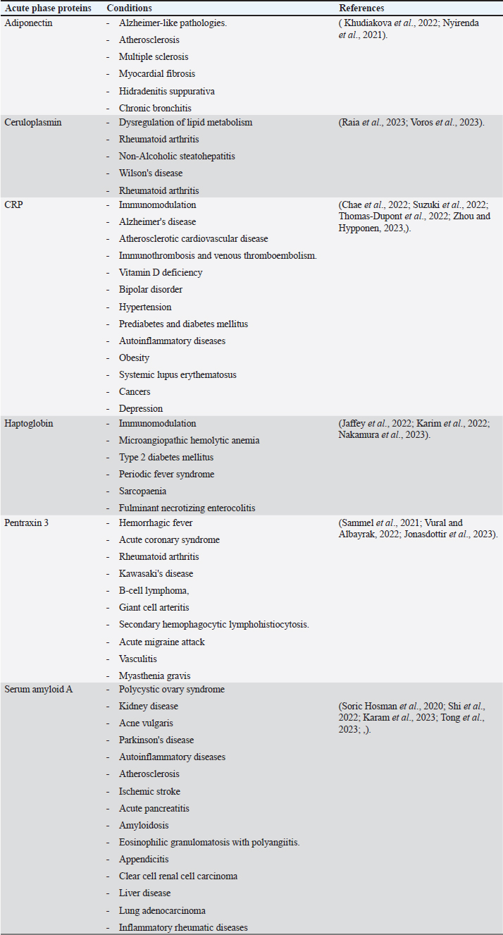 C-reactive proteinThe precise CRP activity levels are shown in Table 1. Clinically, CRP is widely used to assess inflammatory response, although some records have stated its unclear function (Cheng et al., 2022). Records have confirmed their role in the potentiation of phagocytosis (Kinoshita et al., 2021). Its serum level is widely used as a marker for infection/inflammation in emergency circumstances, point-of-care tests, and for the differentiation of viral and bacterial infections (Levinson and Wasserman, 2022). The serum level of CRP has been approved as a diagnostic marker for patients with sepsis and determines the level of E. Coli infection in patients with sepsis (Li et al., 2022). Mouse models have been used to elucidate the immune function of CRP in many trials to isolate and characterize endogenous CRP (Cheng et al., 2022). It has been used to differentiate between upper and lower UTIs induced by E. Coli; CRP levels were higher in upper than in lower UTIs, which enables determination of the anatomical position of UTIs and the method of therapy (Narayan Swamy et al., 2022). It was elevated in the sera of women with recurrent reproductive E. coli (Hasan et al., 2022). CRP is used as a biomarker for the prediction of bacteremia in children with febrile neutropenia, and it has been used with procalcitonin to predict bacterial infection in acute leukemic children (Nahar et al., 2023). It has also been used as a marker for the detection of neonatal sepsis induced by E. coli (Balayan et al., 2020). It can also be used to distinguish bloodstream infections from negative ones (Tang et al., 2020). In combination with WBC count, CRP level could be used as an improved diagnostic tool for gynecological and obstetric patients with infection (Jin et al., 2022). Although huge data have confirmed the association of high serum levels of CRP with E. coli infections, other data have also confirmed its association with other bacteria such as Streptococcus pyogenes (Germont et al., 2020), Proteus mirabilis, Staphylococcus lentus, and Citrobacter braakii (Lenicky et al., 2021). Regardless of the causative bacteria, CRP levels were increased in the sera of infected models, the matter which opened the debate for the ability to consider whether CRP is a specific marker for one species of bacteria or not. As previously mentioned, CRP can be considered a biomarker for the condition induced by the bacteria, not by the bacteria itself. Table 4. APPs associated with non-infectious conditions.