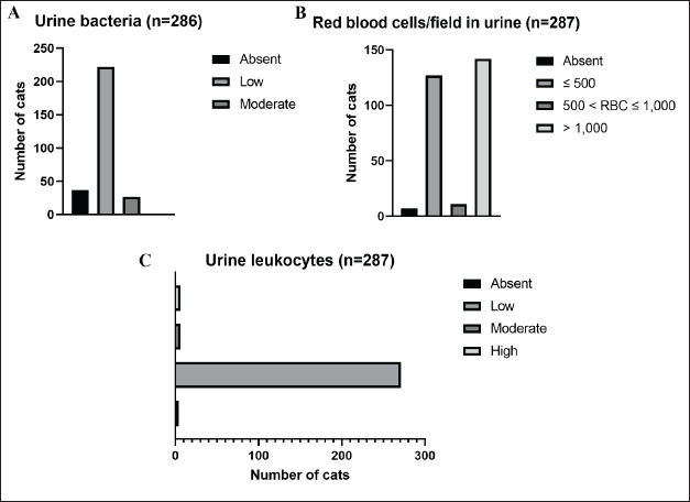 Fig. 3. Frequency distribution of (A) bacteria, (B) red blood cells per field, and (C) leukocytes in the urine sediments in male cats with UO at the Veterinary Teaching Hospital, FMVZ, UNESP, Botucatu, São Paulo, from 2010 to 2020.