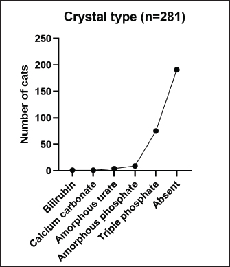 Fig. 4. Frequency distribution of crystal types in 281 male cats diagnosed and treated with UO at the Veterinary Teaching Hospital, FMVZ, UNESP, Botucatu, São Paulo, from 2010 to 2020. The limitations of this study include the variation in the number of tests requested for each animal, which resulted in discrepancies in the number of animals included in the evaluation of each laboratory variable. Similarly, low adherence to urine culture resulted in a low number of animals in which urine cultures were performed. Although the investigation of laboratory changes based on comorbidities in male cats is believed to provide a deeper understanding of the disease in the species, the variation in the number of animals per group would not provide sufficient statistical power in this study, explaining the exclusion of comorbidities in the methodology, and therefore becoming a limitation of the study.