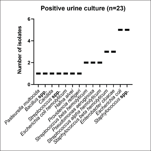 Fig. 5. Main urine isolates in 23 obstructed male cats with bacterial growth among all the male cats with UO that had urine culture performed at the Veterinary Teaching Hospital, FMVZ, UNESP, Botucatu, São Paulo, from 2010 to 2020. The laboratory evaluation of male cats with UO is essential to exclude the underlying causes of obstruction and identify comorbidities and dysfunctions resulting from the obstructive condition. Data collection in this study allowed the description of possible laboratory changes and those most prevalent in the population under study. The description resulting from data collection with a significant number of animals makes this document reference material for veterinarians regarding the changes expected in an obstructed male cat. Therefore, it is important to note that while certain laboratory abnormalities such as azotemia, acidemia, metabolic acidosis, hyperkalemia, hypocalcemia, acidic pH, and occult blood in the urine are commonly expected in UO, each patient must be thoroughly evaluated based on their clinical condition. This is because UO may result from an underlying illness not directly related to the urinary tract. AcknowledgmentsThe authors are immensely grateful to the archives sector of the Veterinary Hospital of the Faculty of Veterinary Medicine and Zootechnics of Unesp, Botucatu, São Paulo, for making the data for this investigation available. Conflict of interestThe authors declare no conflict of interest. FundingThis research received no specific grant. Author contributionConceptualization: Reiner Silveira de Moraes, Priscylla Tatiana Chalfun Guimarães-Okamoto; Methodology: Reiner Silveira de Moraes, Henry David Mogollón García; Data Collection: Reiner Silveira de Moraes; Data Processing: Reiner Silveira de Moraes, Henry David Mogollón García, Diego Ribeiro; Data Analysis & Interpretation: Reiner Silveira de Moraes, Henry David Mogollón García, Diego Ribeiro; Writing-Original Draft: Reiner Silveira de Moraes, Diego Ribeiro; Writing-Review & Editing: Alessandra Melchert, Doughlas Regalin, Raphael Lúcio Andreatti Filho, Rogério Giufrida, Regina Kiomi Takahira, Adriano Sakai Okamoto, Priscylla Tatiana Chalfun Guimarães-Okamoto; Supervision: Priscylla Tatiana Chalfun GuimarãesOkamoto Critical Review: Henry David Mogollón García, Alessandra Melchert, Rogério Giufrida, Regina Kiomi Takahira, Priscylla Tatiana Chalfun Guimarães-Okamoto. Data availabilityAll the data is presented in this manuscript. Any additional data are available from the authors upon reasonable request and with permission from the corresponding author. ReferencesAbdel-Saeed, H., Tahon, R.R. and Farag, H.S. 2020. Diagnostic and epidemiological studies on obstructive feline lower urinary tract disease (FLUTD) with special reference to anatomical findings in Egyptian Tomcats. Bulg. J. Vet. Med. 24, 383–394. Balakrishnan, A. and Drobatz, K.J. 2013. Management of urinary tract emergencies in small animals. Vet Clin. North Am. Small Anim. Pract. 43, 843–867. Canei, D.H., Pereira, M.E., Freitas, M.N., Trevisan, Y.P.A., Zorzo, C., Bortolini, J., Mendonça, A.J., Sousa, V.R.F. and Almeida, A.B.P.F. 2021. Biochemical, electrolytic, and cardiovascular evaluations in cats with urethral obstruction. Vet. World. 14, 2002–2008. Chapman, T.A., Wu, X.Y., Barchia, I., Bettelheim, K.A., Driesen, S., Trott, D., Wilson, M. and Chin, J.J.C. 2006. Comparison of virulence gene profiles of Escherichia coli strains isolated from healthy and diarrheic swine. Appl. Environ. Microbiol. 72, 4782–4795. Clermont, O., Bonacorsi, S. and Bingen, E. 2000. Rapid and simple determination of the Escherichia coli phylogenetic group. Appl. Environ. Microbiol. 66, 4555–4558. Cortes-Penfield, N.W., Trautner, B.W. and Jump, R. 2017. Urinary tract infection and asymptomatic bacteriuria in older adults. Infect. Dis. Clin. North Am. 31, 673–688. Dinallo, H.R., Giuffrida, R., Azevedo, M.G.P., Santarém, C.L., Andrade, S.M.C.F., Brinholi, R.B., Motta, Y.P., Schmidt, S.E.M., Ferreira, J.C.P., García, H.D.M., Brito, A.F., Melchert, A. and Okamoto, P.T.C.G. 2022. Acute-phase proteins in cats with obstructive feline lower urinary tract disease. Vet. Clin. Pathol. 51, 77–83. Dinler Ay, C., Tuna, G.E., Ulutaş, B. and Voyvoda, H. 2021. Clinicopathological characteristics of cats with obstructive lower urinary tract disease in the Aydın province (Turkey). Kocatepe Vet. J. 14, 474–481. Dorsch, R., Remer, C., Sauter-Louis, C. and Hartmann, K. 2014. Feline lower urinary tract disease in a German cat population: a retrospective analysis of demographic data, causes and clinical signs. Tierarztl. Prax. Ausg. K. Kleintiere Heimtiere 42, 231–329. Dorsch, R., Teichmann-Knorrn, S. and Lund, H.S. 2019. Urinary tract infection and subclinical bacteriuria in cats—a clinical update. J. Feline Med. Surg. 21, 1023–1038. Drobatz, K.J. and Hughes, D. 1997. Concentration of ionized calcium in plasma from cats with urethral obstruction. J. Am. Vet. Med. Assoc. 211, 1392–1395. Ellis, J., Bell, R., Barnes, D.C. and Miller, R. 2018. Prevalence and disease associations in feline thrombocytopenia: a retrospective study of 194 cases. J. Small Anim. Pract. 59, 531–538. Fascetti, A.J., Mauldin, G.E. and Mauldin, G.N. 1997. Correlation between serum creatine kinase activities and anorexia in cats. J. Vet. Intern. Med. 11, 9–13. Forrester, S.D. 2004. Diagnostic approach to hematuria in dogs and cats. Clin. North Am. Small Anim. Pract. 34, 849–66. Fröhlich, L., Hartmann, K., Sautter-Louis, C. and Dorsch, R. 2016. Postobstructive diuresis in cats with naturally occurring lower urinary tract obstruction: incidence, severity and association with laboratory parameters on admission. J. Feline Med. Surg. 18, 809–817. Gerber, B., Boretti, F.S., Kley, S., Laluha, P., Müller, C., Sieber, N., Unterer, S., Wenger, M., Flückiger, M., Glaus, T. and Reusch, C.E. 2005. Evaluation of clinical signs and causes of lower urinary trac